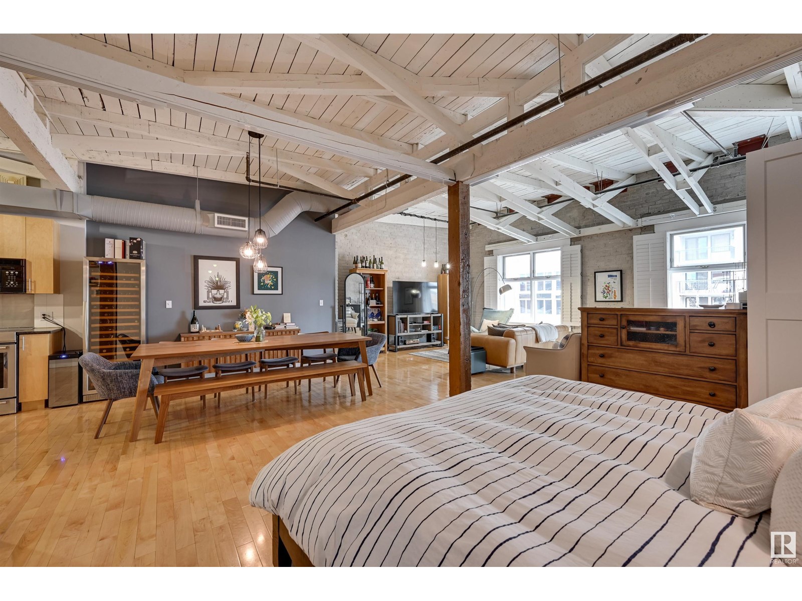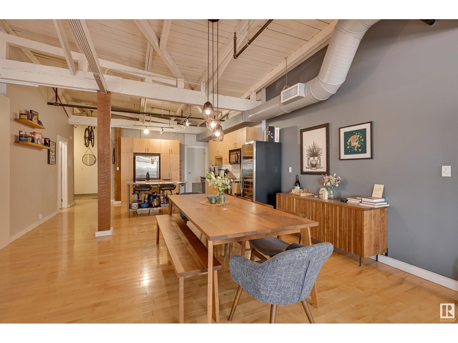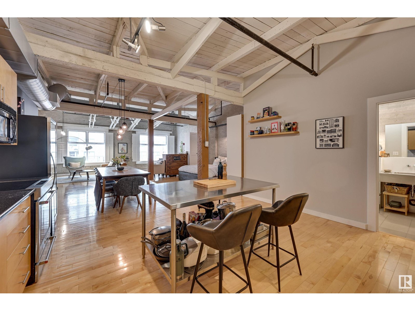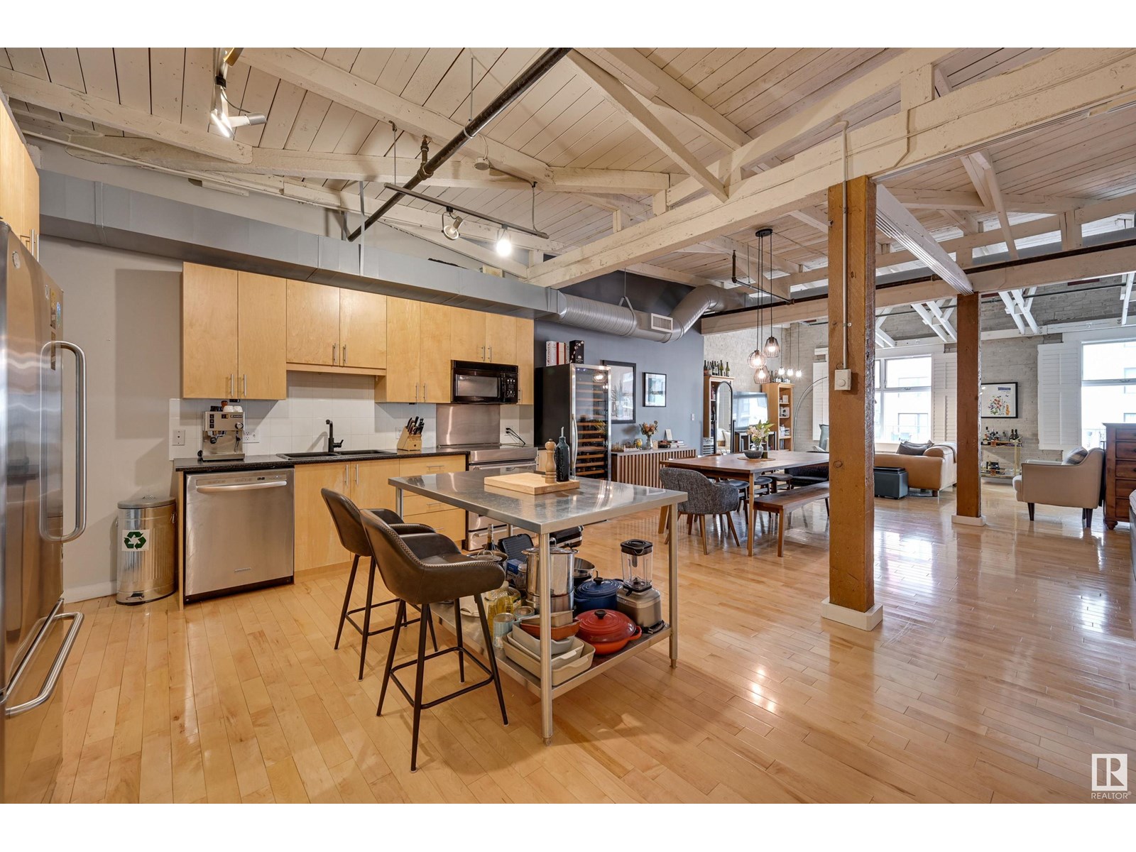 Penthouse unit in one of edmonton’s most iconic buildings: phillips lofts! located in the heart of downtown on the always-vibrant 104th street promenade, this loft delivers the ultimate urban lifestyle—just steps from trendy bars, top restaurants, local markets, and the ice district. this one-of-a-kind space features a private elevator entrance, open beam raised ceilings, and huge west-facing windows offering views of 104th and beyond. the expansive open-concept layout is perfect for entertaining, and the updated bathroom adds a touch of modern luxury. the open concept kitchen features a large stainless steel island, a generous amount of cabinetry and is open to a spacious dining area. the sprawling living room is a great place to curl up and watch a move - with space left over for an office! stylish, spacious, and set in one of edmonton’s most desirable downtown locations—this loft is not to be missed. in-suite laundry, roof top patio access with sweeping downtown view and underground parking included! (id:62933)