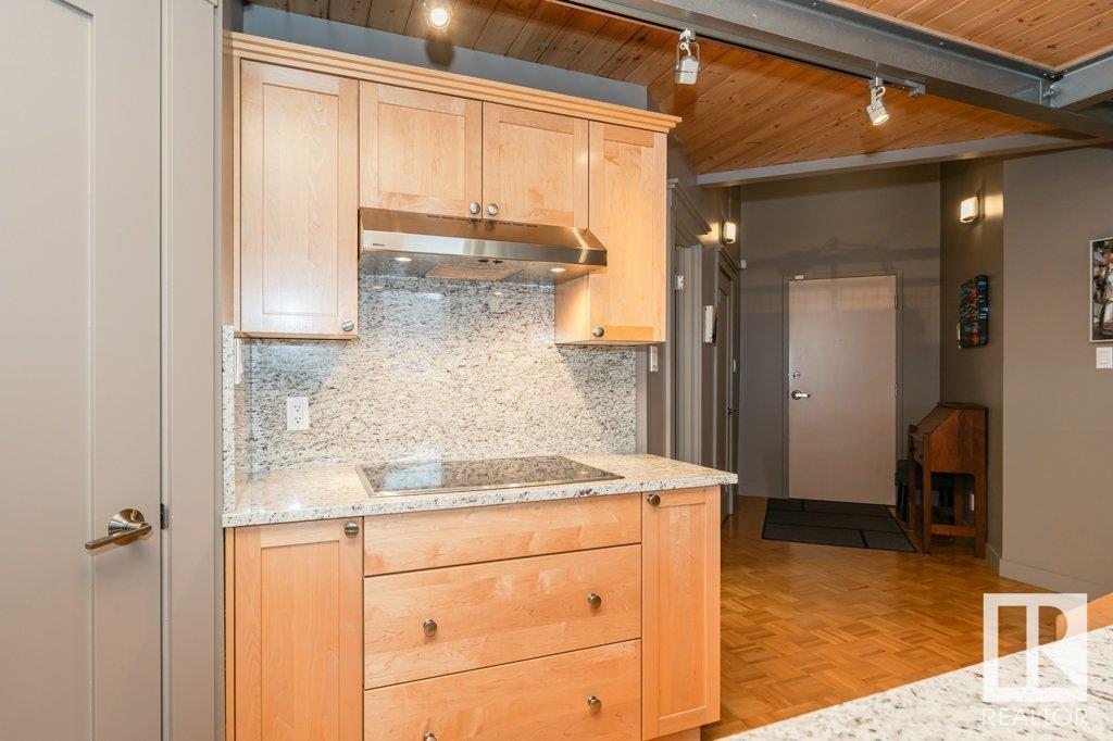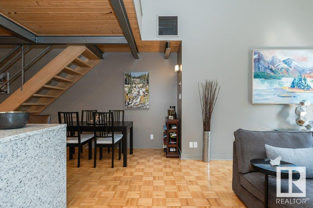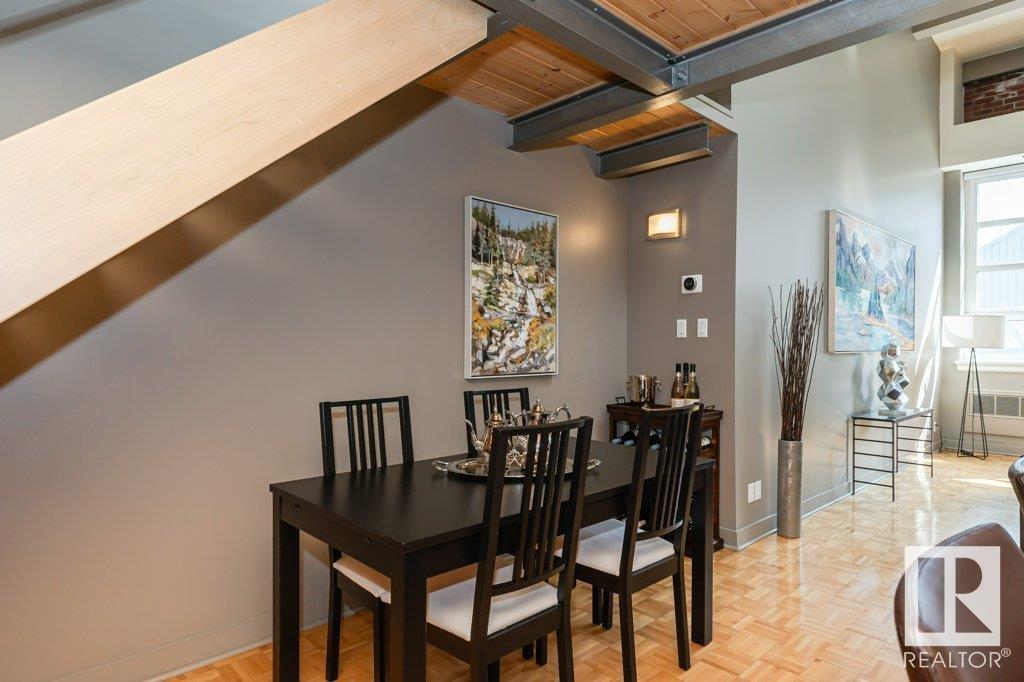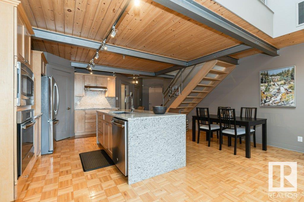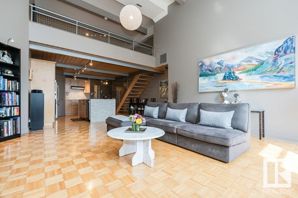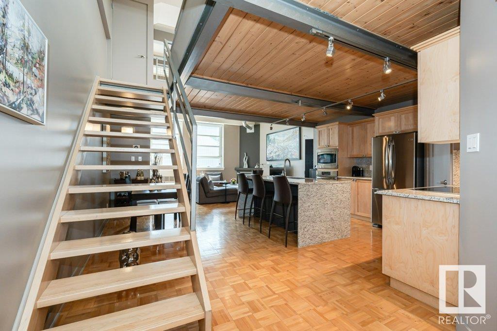 Magazine worthy! featured in edify magazine and on the ballet edmonton home tour! this home is a true hidden gem that provides peace, quiet and privacy in the epicenter of the downtown core. the churchill exchange. new york style loft. stylish, contemporary and elegant. 1150 sqft 2 story loft. 1 bedroom, 1.5 baths. a wide-open space ideal for your creative genius. soaring double-height ceilings. large windows. concrete & steel construction. central a/c. stunning walls ideal for art. rare loft condo with lots of storage. gorgeous island kitchen c/w stainless steel appliances and walk-in pantry. upper loft suite features bedroom and lounge area open to below, ensuite and large walk-in closet. large in-suite laundry. no upstairs neighbour. heritage building with beautiful common areas. shared rooftop deck. titled u/g stall. storage locker. stroll to everything! a true urban hide-a-way, quiet, private, secluded. the ultimate downtown lifestyle. (id:62933)