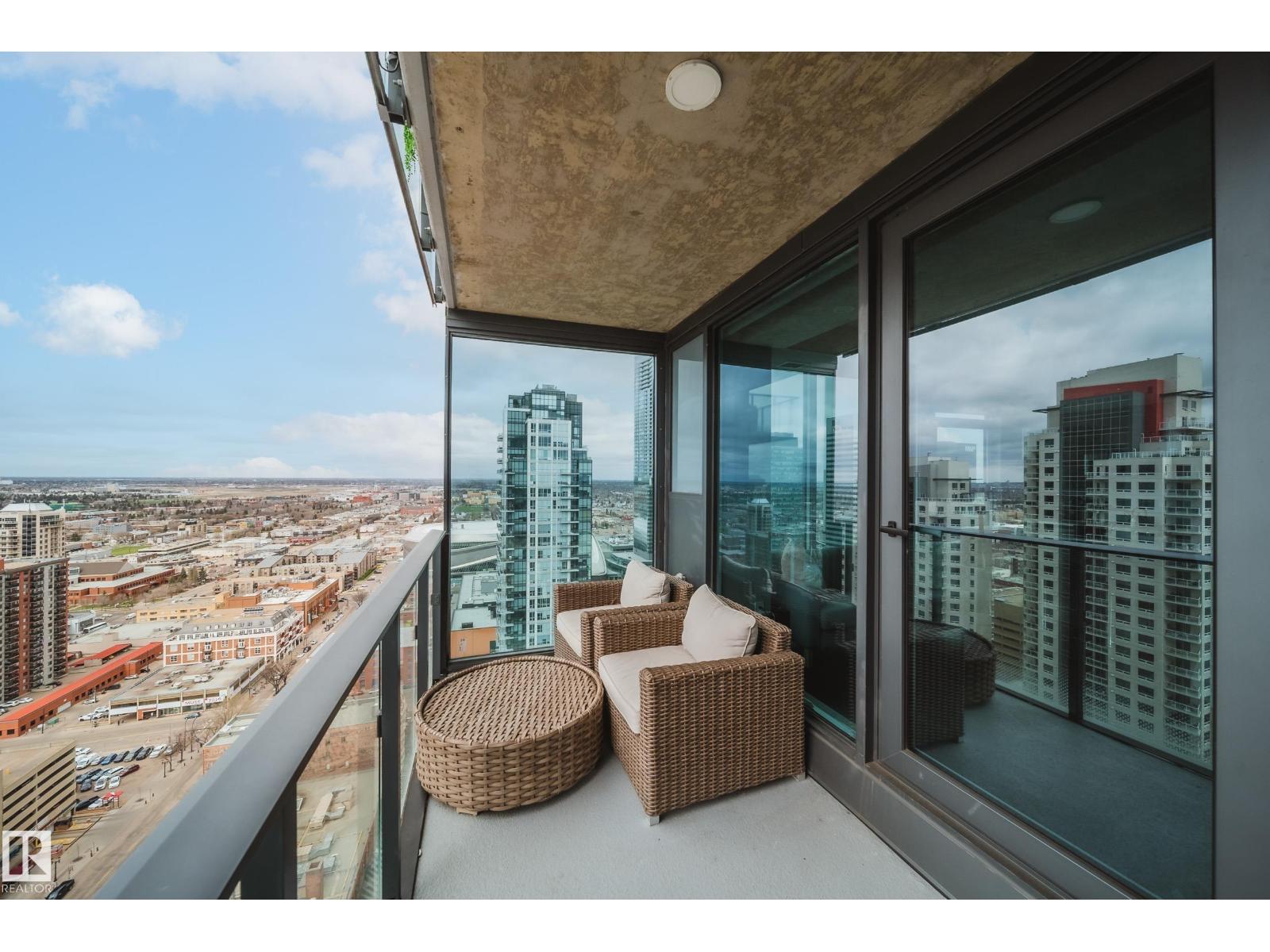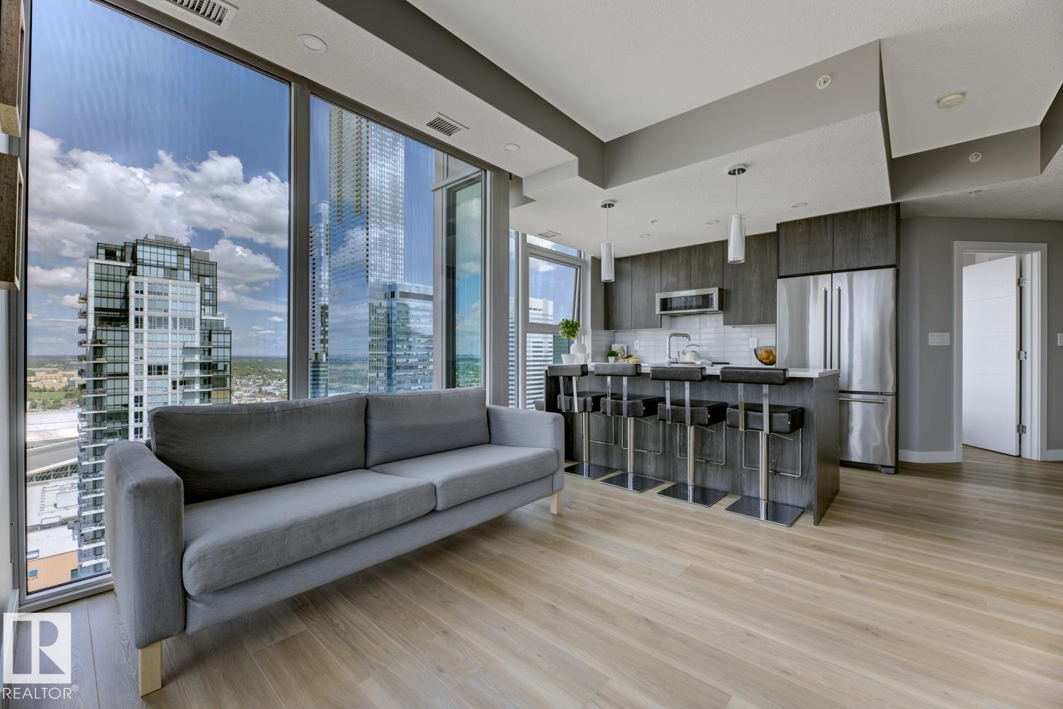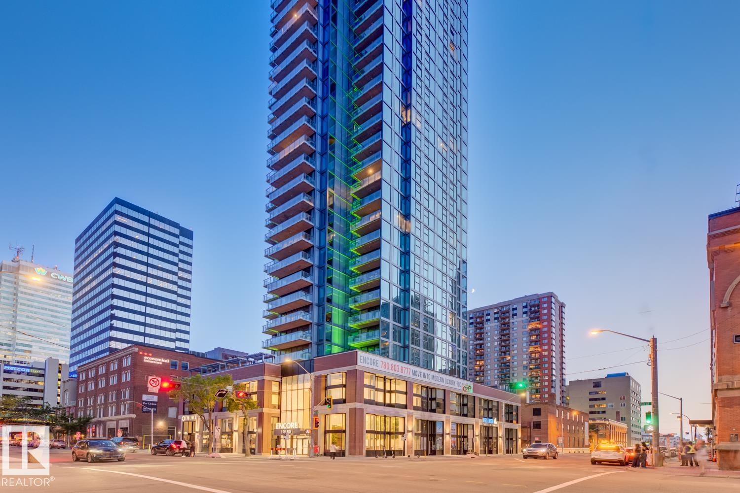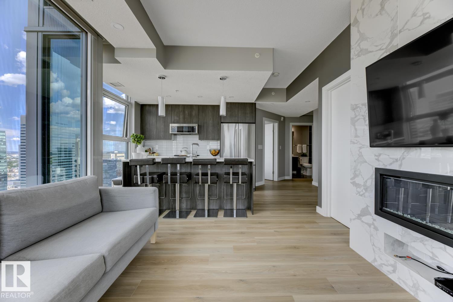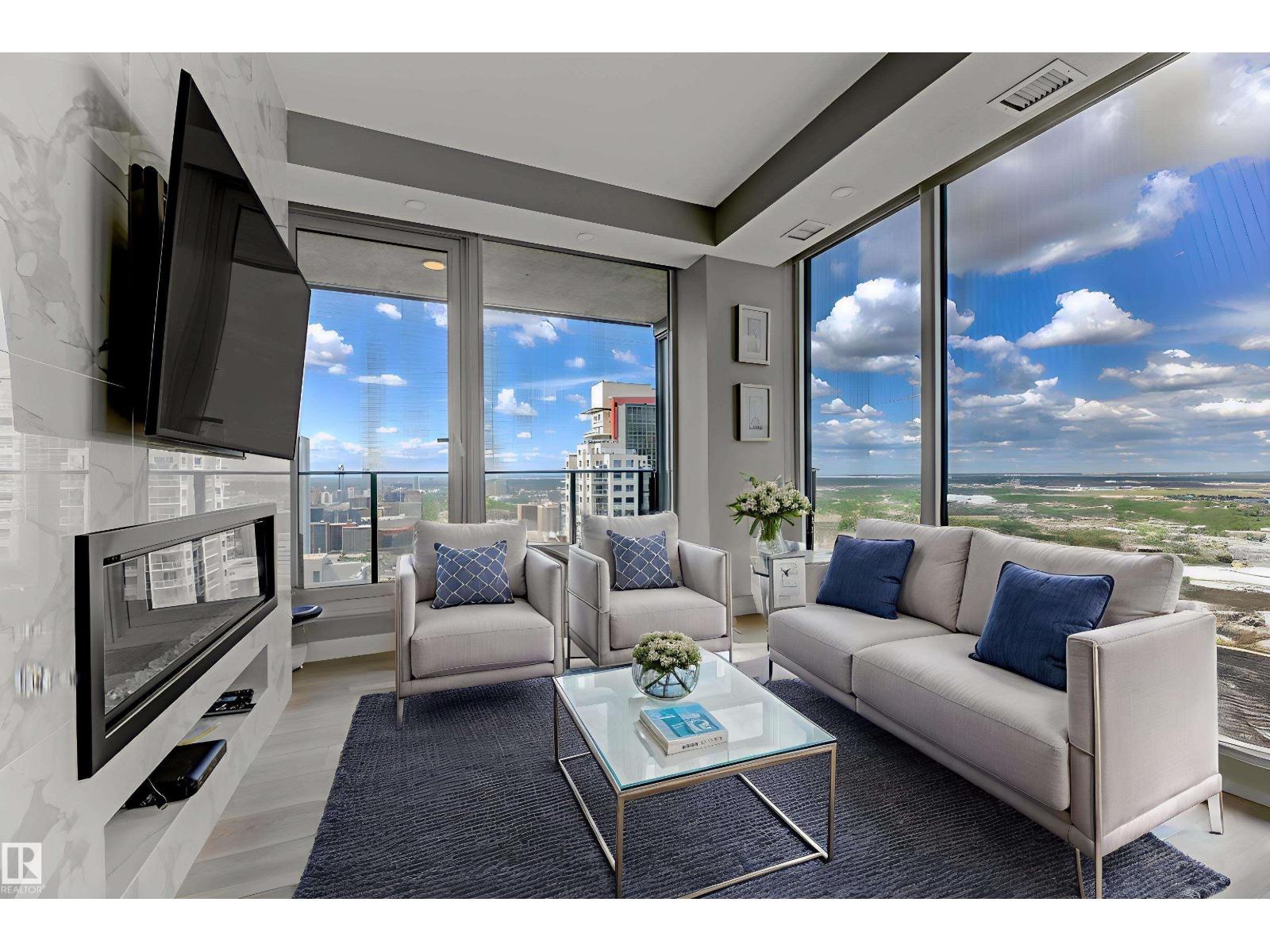 **upgraded**elevate your lifestyle in this stunning 29th-floor condo at encore tower, just steps from rogers place and edmonton's vibrant ice district. soak in breathtaking 180° downtown views through floor-to-ceiling windows and unwind by the striking marble fireplace. the modern chef’s kitchen featuring kitchenaid’s upgraded *red seal*stainless steel appliances and sleek quartz countertops. this 2-bedroom, 2-bath unit includes a luxurious primary suite with ensuite, walk in shower, and california closets. the private balcony is the perfect place for morning coffee or after-work refreshment, while building amenities include a fitness centre, social lounge, outdoor terrace, and titled underground parking with storage locker. live stylishly at the center of it all. (id:62933)