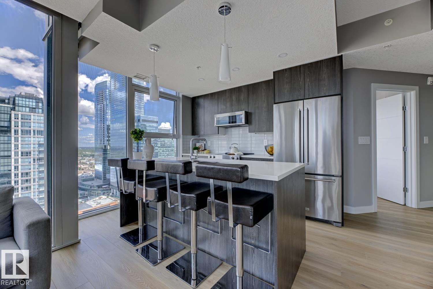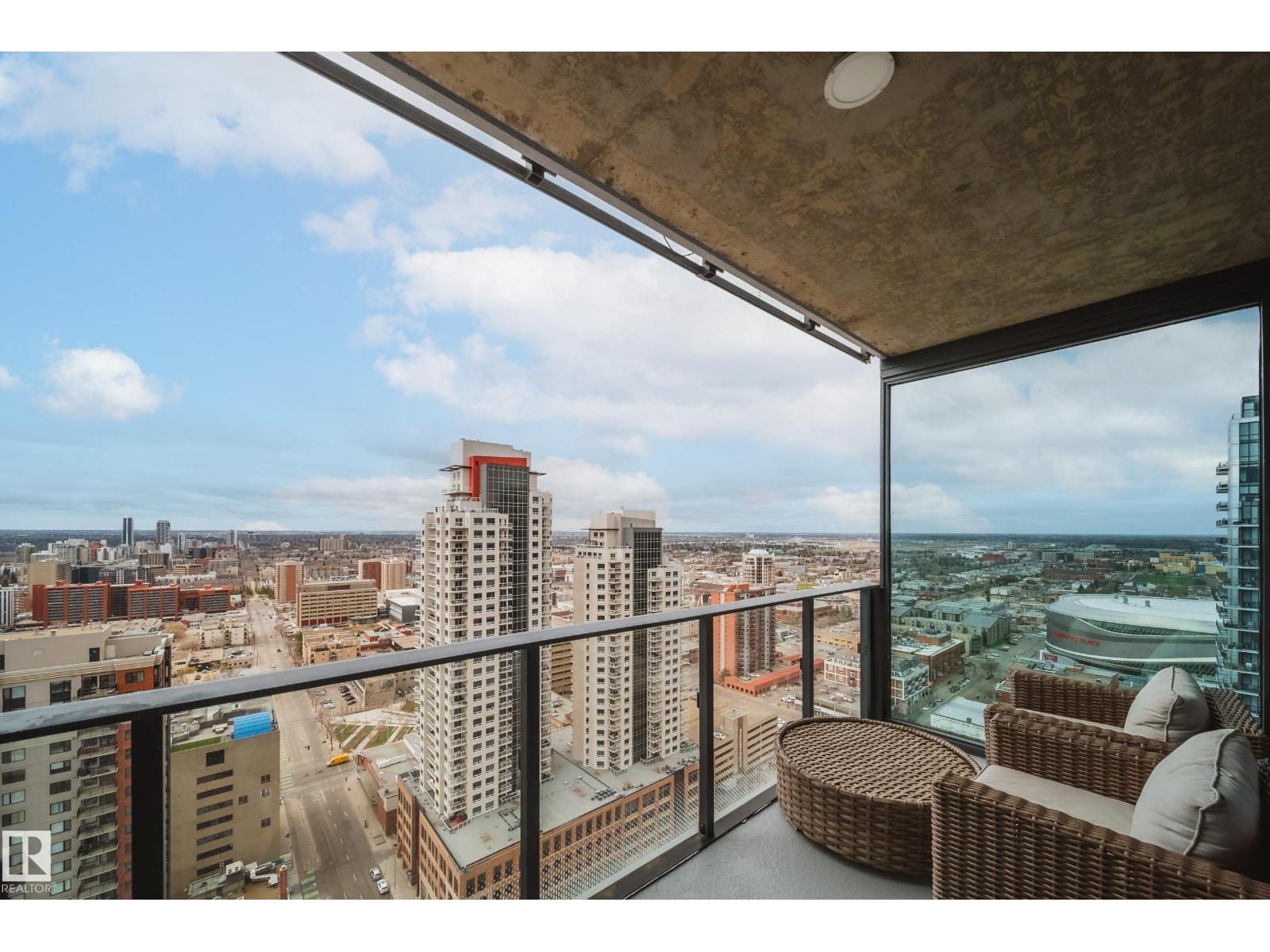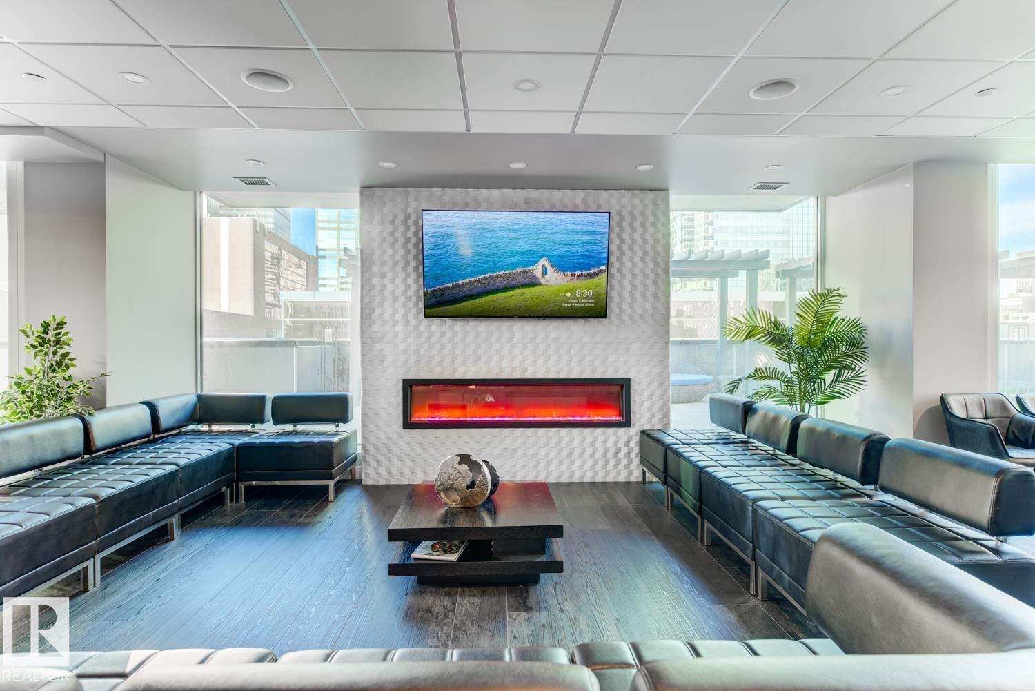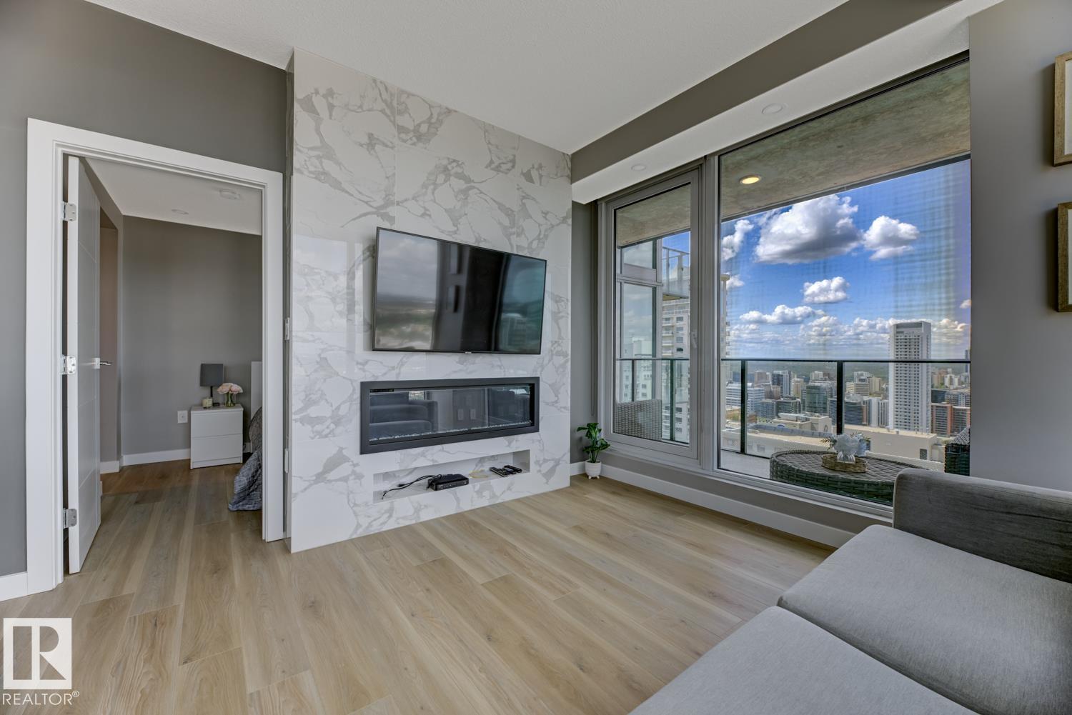 **upgraded**elevate your lifestyle in this stunning 29th-floor condo at encore tower, just steps from rogers place and edmonton's vibrant ice district. soak in breathtaking 180° downtown views through floor-to-ceiling windows and unwind by the striking marble fireplace. the modern chef’s kitchen featuring kitchenaid’s upgraded *red seal*stainless steel appliances and sleek quartz countertops. this 2-bedroom, 2-bath unit includes a luxurious primary suite with ensuite, walk in shower, and california closets. the private balcony is the perfect place for morning coffee or after-work refreshment, while building amenities include a fitness centre, social lounge, outdoor terrace, and titled underground parking with storage locker. live stylishly at the center of it all. (id:62933)