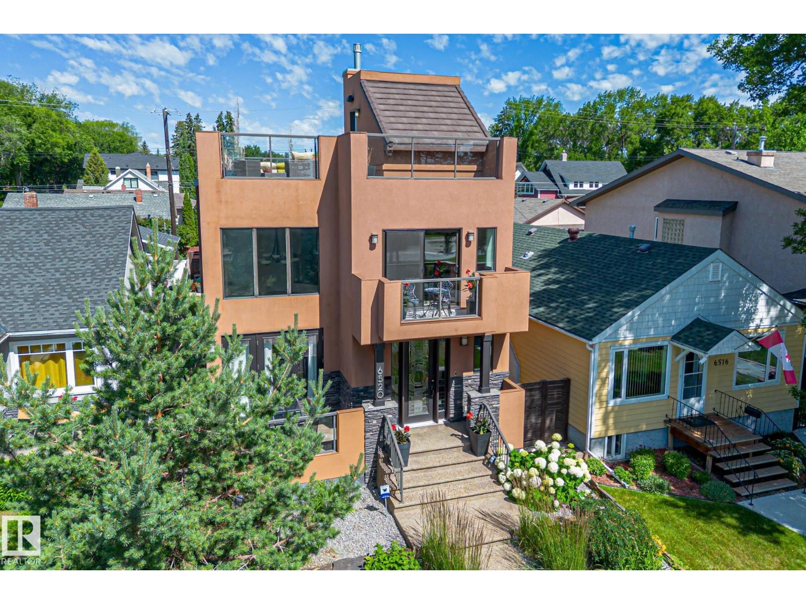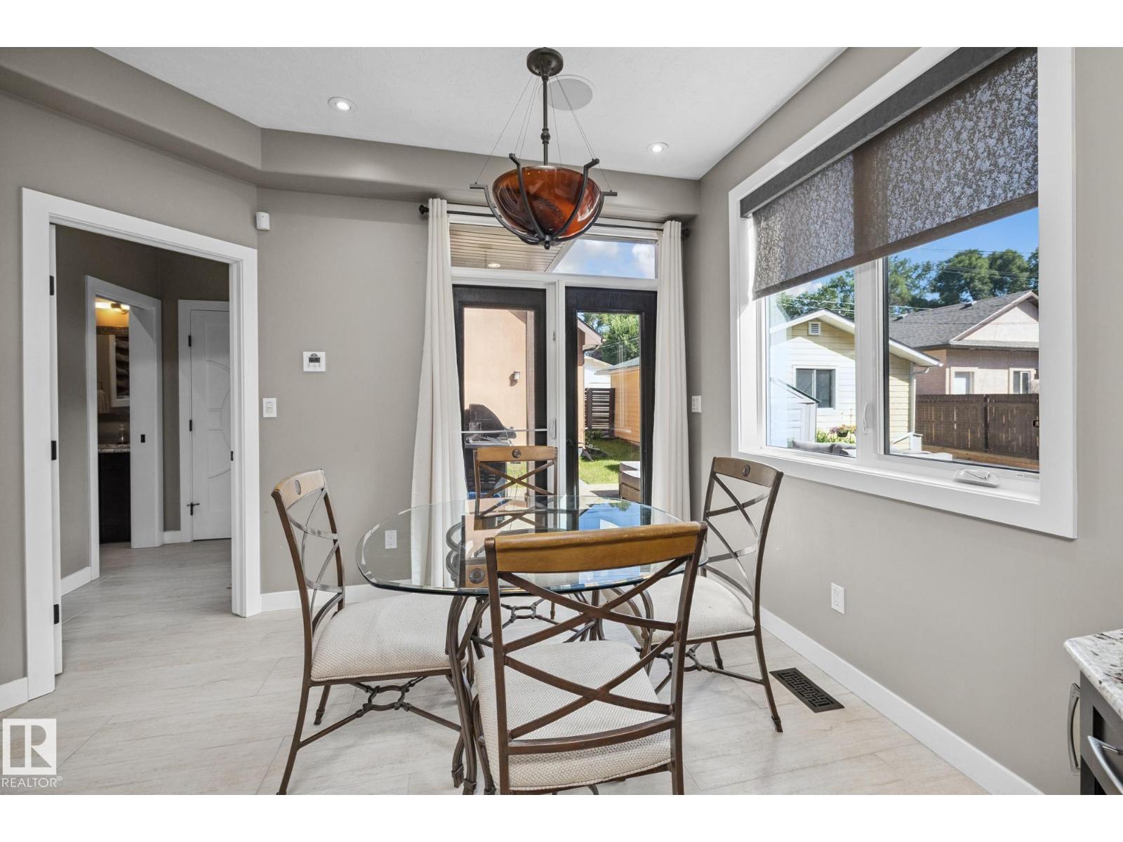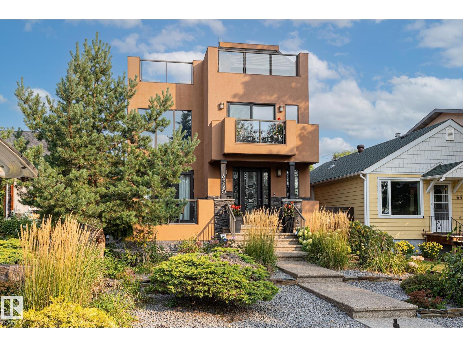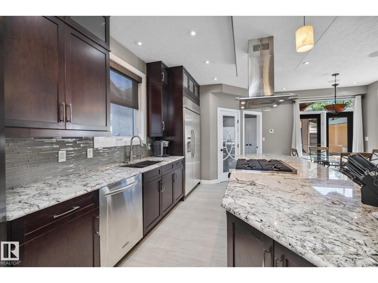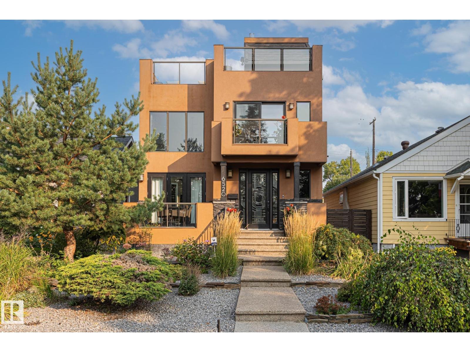 Imagine rooftop sunsets over the river valley from a patio nearly the size of your home. this stunning 4-bedroom 3.5-bath property sits across from highlands golf course, in edmonton’s coveted highlands community is a rare find. overlooking henry martell park and highlandia, you can walk to fox burger, bodega, kind ice cream and candid coffee then come home to floor-to-ceiling windows, a curved open staircase and a sleek 3-way fireplace. the chef’s kitchen is built for hosting with a viking double oven, granite counters, a large island and walk-in pantry. upstairs the private primary retreat features a walk-in closet and spa-inspired ensuite with steam shower. a sunny front patio is perfect for morning coffee while the rooftop patio sets the stage for unforgettable gatherings under the stars. the finished basement adds more bedrooms, a rec space and full bath. newly vinyl fenced yard, garden beds and a double garage with loft storage. an exquisite highlands lifestyle in a sought-after location. (id:62933)