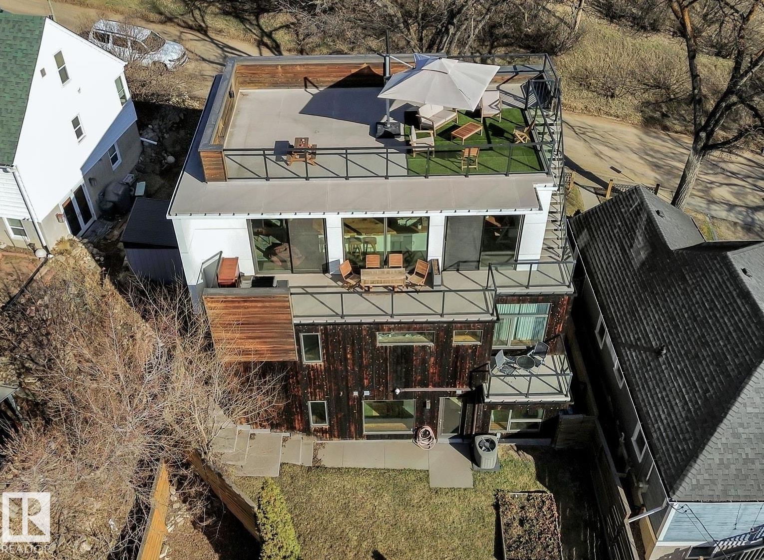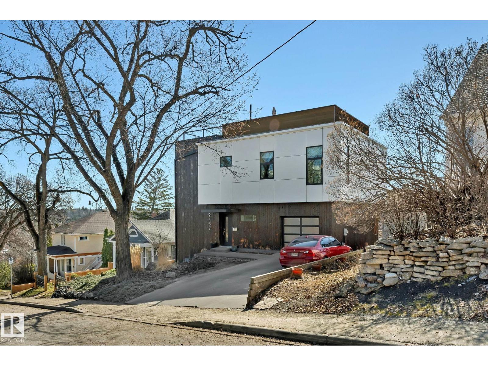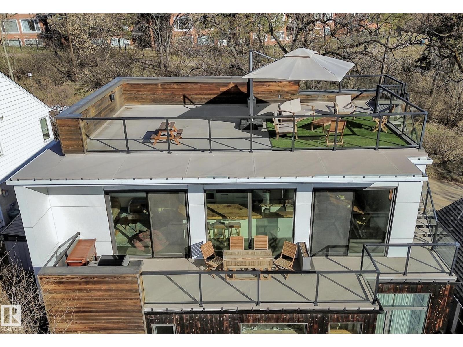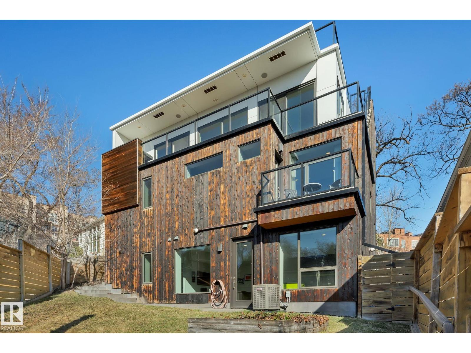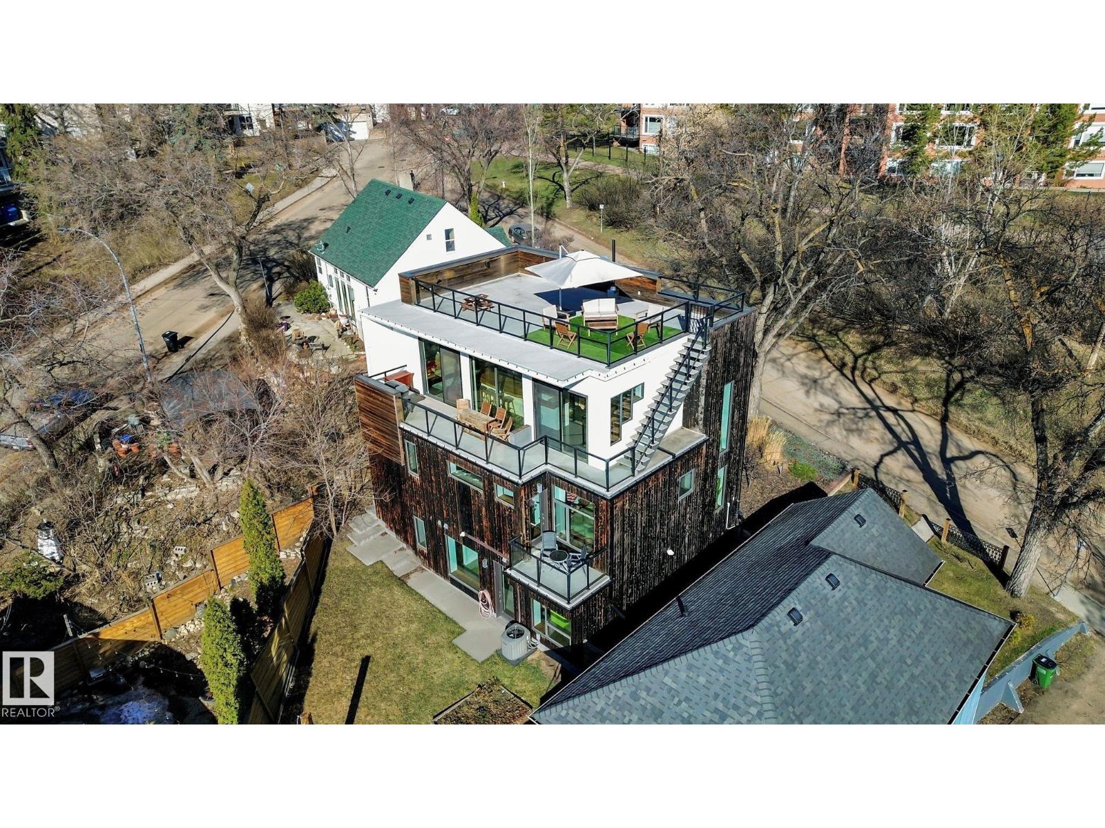 Steps from downtown and the river valley, this iconic modern home in edmonton’s riverdale offers unmatched access to trails, cafes, parks, and city life. enjoy stunning 270° views from the rooftop patio, overlooking lush river valley landscapes and skyline. architecturally striking, it features shou sugi ban cedar siding, polished concrete floors, built-in a/c, and a wired-in surround sound system. the open-concept main floor showcases glossy cabinetry and a dramatic 16-ft redwood island. the loft-inspired main-level primary suite offers reclaimed wood flooring, exposed brick, and a spa-like italian marble ensuite. three additional bedrooms, a stylish bath, and an office provide space for family or work. the walkout basement is made for entertaining, with a full bath, sauna, and custom bar. energy-efficient with green building touches and over 2,600 sqft of upscale living space, this home defines urban luxury steps from nature, and just minutes to downtown’s cafes, parks, trails, and river valley access. (id:62933)