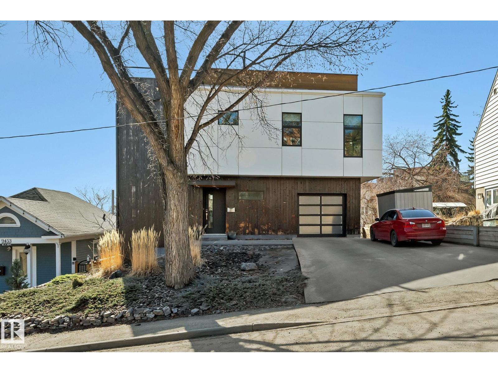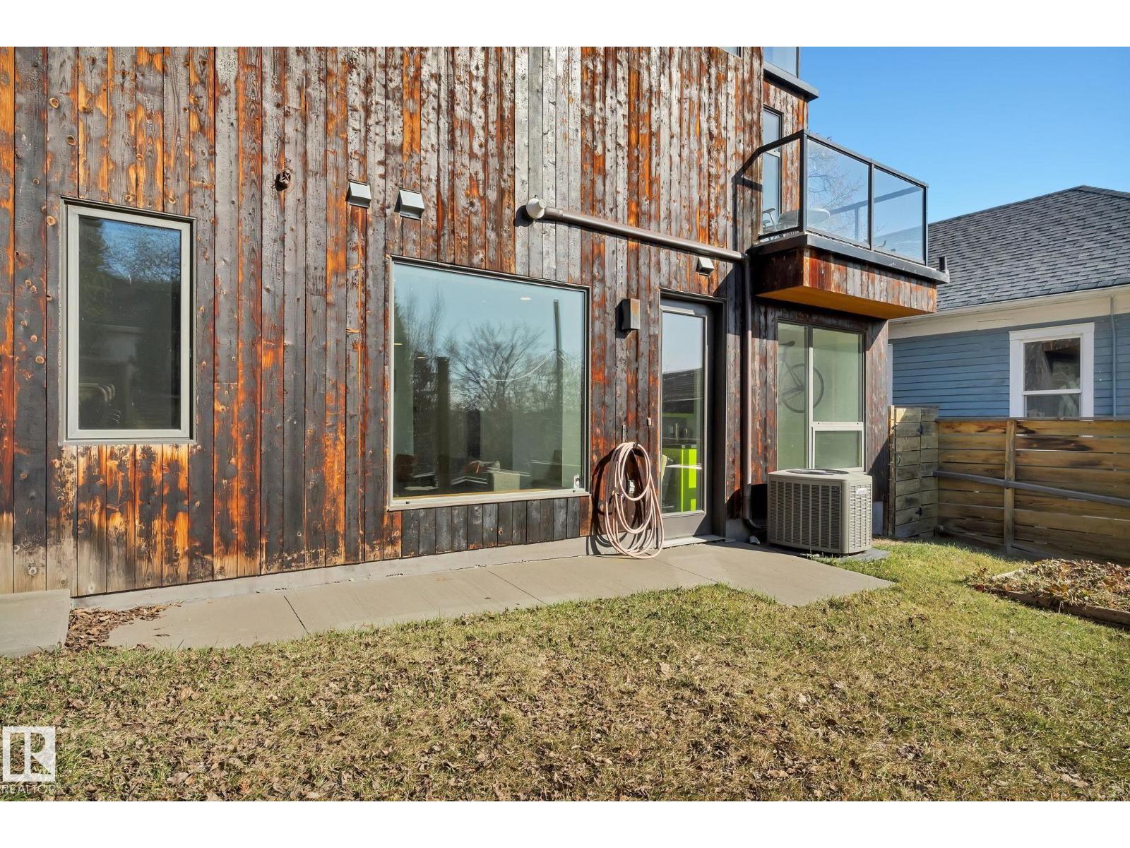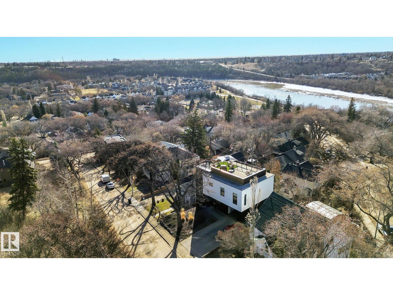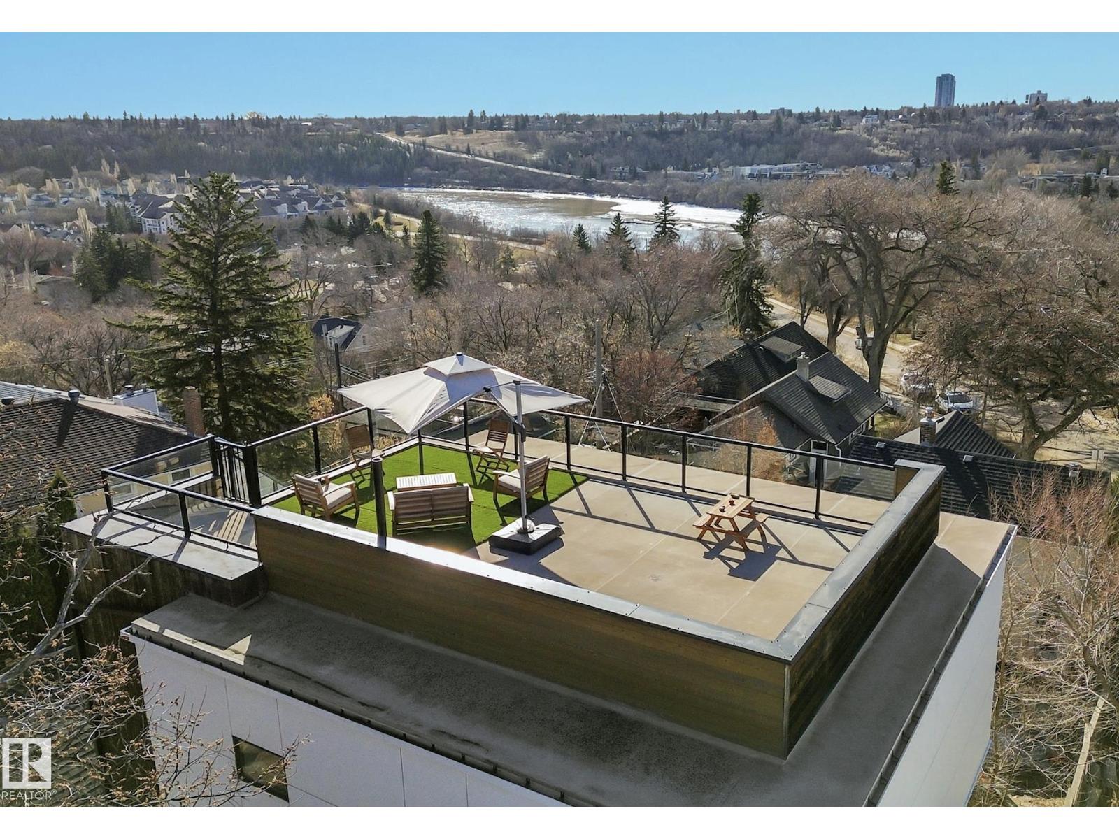 Steps from downtown and the river valley, this iconic modern home in edmonton’s riverdale offers unmatched access to trails, cafes, parks, and city life. enjoy stunning 270° views from the rooftop patio, overlooking lush river valley landscapes and skyline. architecturally striking, it features shou sugi ban cedar siding, polished concrete floors, built-in a/c, and a wired-in surround sound system. the open-concept main floor showcases glossy cabinetry and a dramatic 16-ft redwood island. the loft-inspired main-level primary suite offers reclaimed wood flooring, exposed brick, and a spa-like italian marble ensuite. three additional bedrooms, a stylish bath, and an office provide space for family or work. the walkout basement is made for entertaining, with a full bath, sauna, and custom bar. energy-efficient with green building touches and over 2,600 sqft of upscale living space, this home defines urban luxury steps from nature, and just minutes to downtown’s cafes, parks, trails, and river valley access. (id:62933)