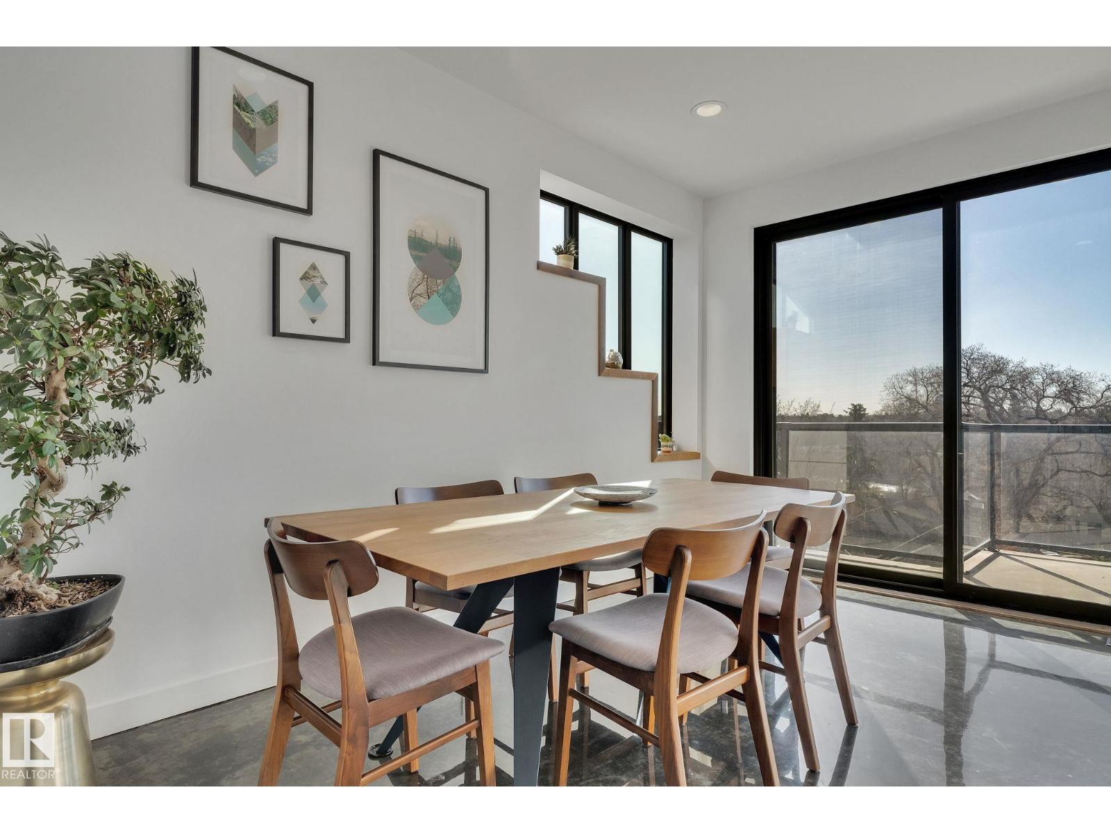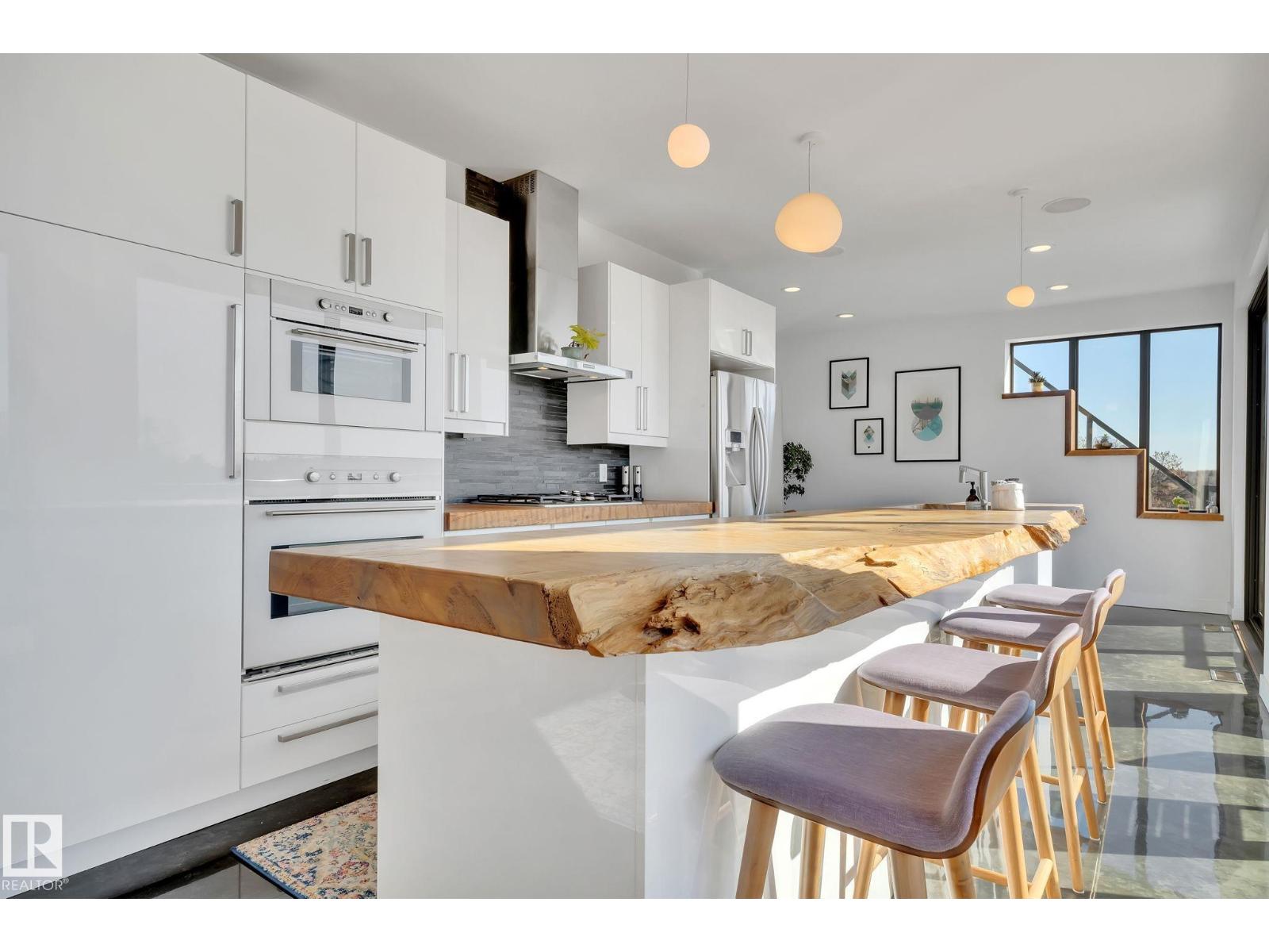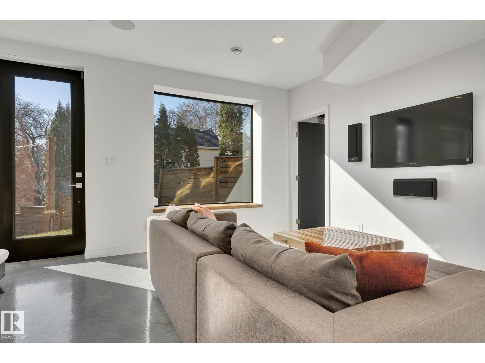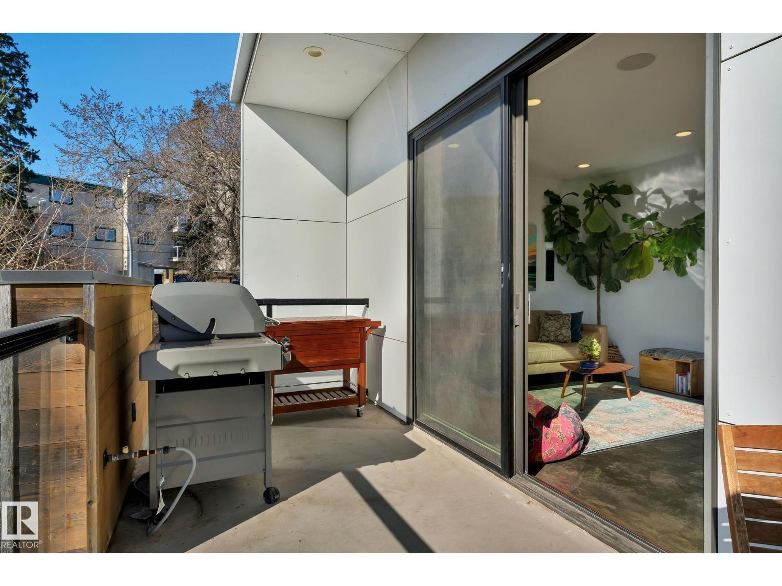 Steps from downtown and the river valley, this iconic modern home in edmonton’s riverdale offers unmatched access to trails, cafes, parks, and city life. enjoy stunning 270° views from the rooftop patio, overlooking lush river valley landscapes and skyline. architecturally striking, it features shou sugi ban cedar siding, polished concrete floors, built-in a/c, and a wired-in surround sound system. the open-concept main floor showcases glossy cabinetry and a dramatic 16-ft redwood island. the loft-inspired main-level primary suite offers reclaimed wood flooring, exposed brick, and a spa-like italian marble ensuite. three additional bedrooms, a stylish bath, and an office provide space for family or work. the walkout basement is made for entertaining, with a full bath, sauna, and custom bar. energy-efficient with green building touches and over 2,600 sqft of upscale living space, this home defines urban luxury steps from nature, and just minutes to downtown’s cafes, parks, trails, and river valley access. (id:62933)
