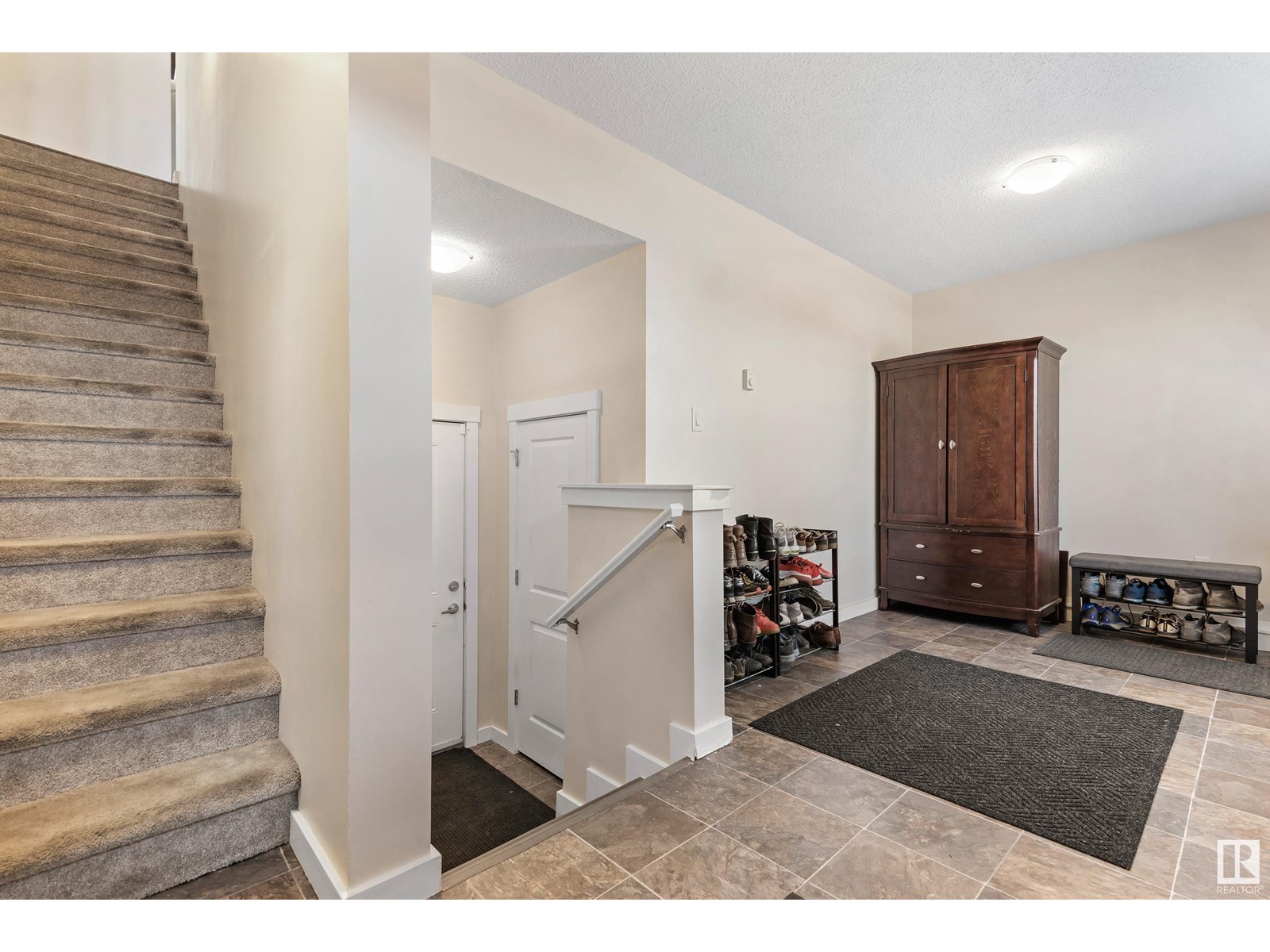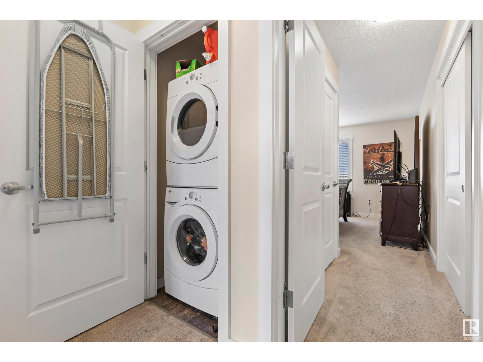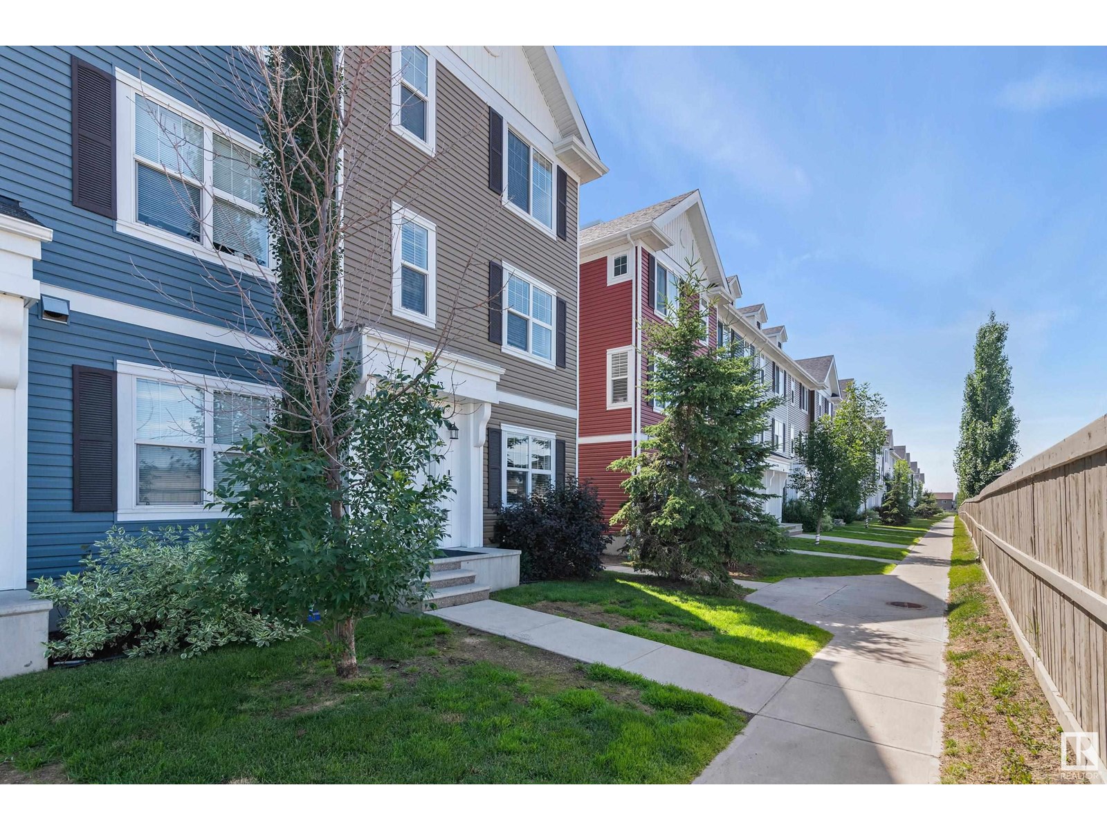 Welcome to this outstanding 3 bedroom, 2.5 bath, double attached garage end-unit townhouse. located in a great family area across from a pond, with bonus access to anthony henday, cfb edmonton, shops, and restaurants. this nicely maintained townhouse has a/c, which comes in handy for those hot summer days. other notable features are 9 ft ceilings on the main floor, beautiful espresso kitchen cabinets, quartz countertops, spacious, open, bright floor plan, dining room, living room with electric fireplace, vinyl plank floors, and ceramic tile in the 2pc bath. stainless steel appliances. spacious deck with gas line and central vac. the upper level has 3 good-sized bedrooms with a 4pc and 3pc ensuite, and a walk-in closet. carpet and ceramic floors in bathrooms and a stackable washer/dryer. the double attached garage is drywalled, insulated, and has 11 ft ceilings. (id:62933)