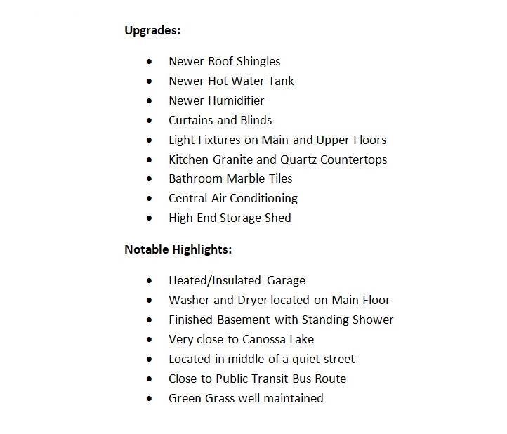 Absolutely stunning 2-storey home with endless upgrades all over the home with a fully finished basement and an insulated heated garage. no pets and non-smoking home. this home has 4 bedrooms and 4 bathrooms, main floor laundry, central a/c, gas fireplace, dream kitchen with granite/quartz countertops, and huge pantry. full sized newly painted deck, high end storage shed with front/side windows and skylight. the master bedroom features a barn door, gleaming hardwood floors, his and her closets, 5pcs ensuite with live edge countertop, double sinks, 2 shower heads, and tile flooring. the main bathroom has new marble floors and cabinets. the basement is fully finished with a 3pcs bathroom, bedroom, family room. upgrades includes: newer roof shingles, hot water tank, humidifier, a/c, light fixtures, curtains and blinds. just steps away to access the canossa lake, public transportation, picnic areas, & playgrounds. (id:62933)