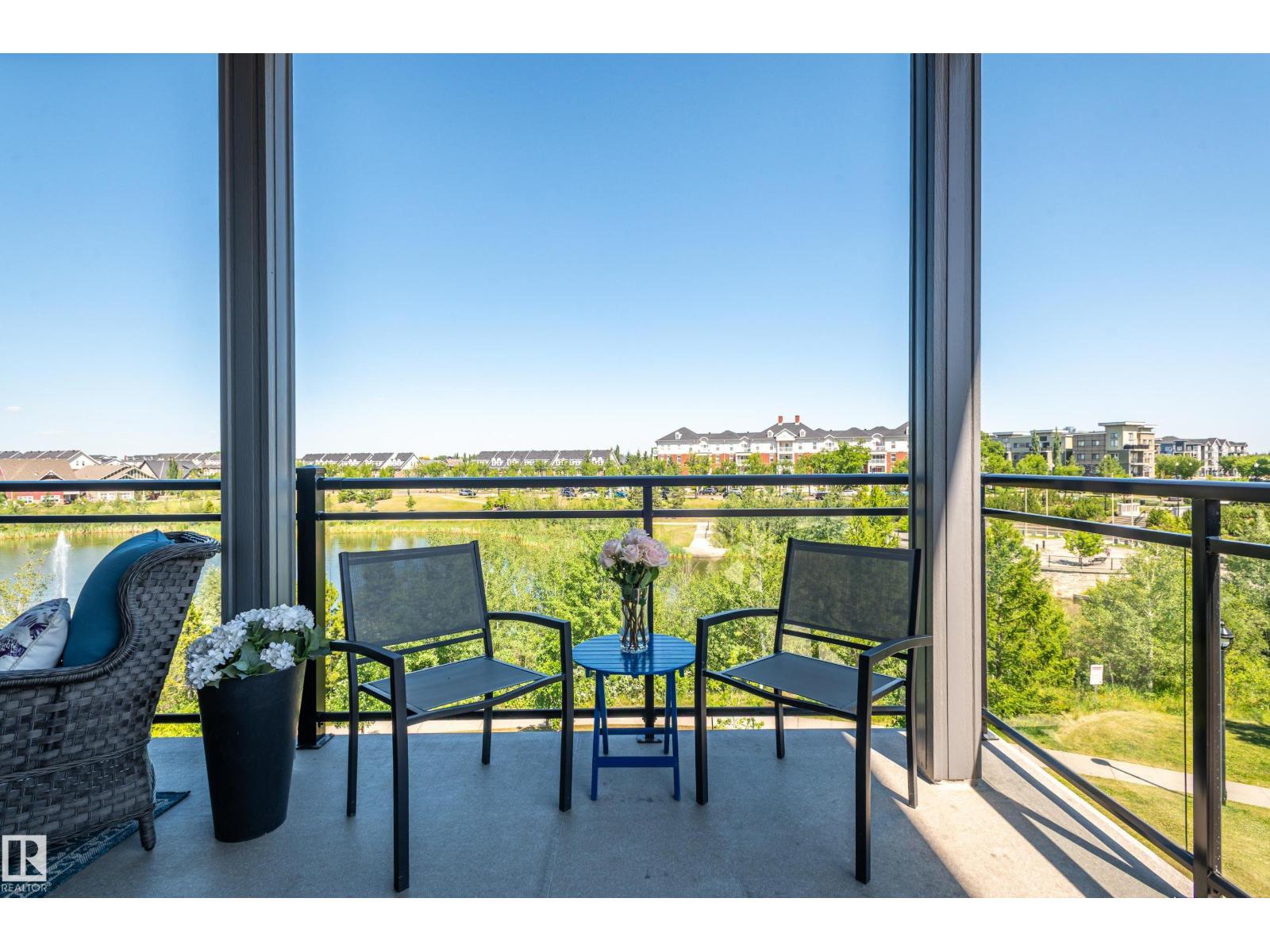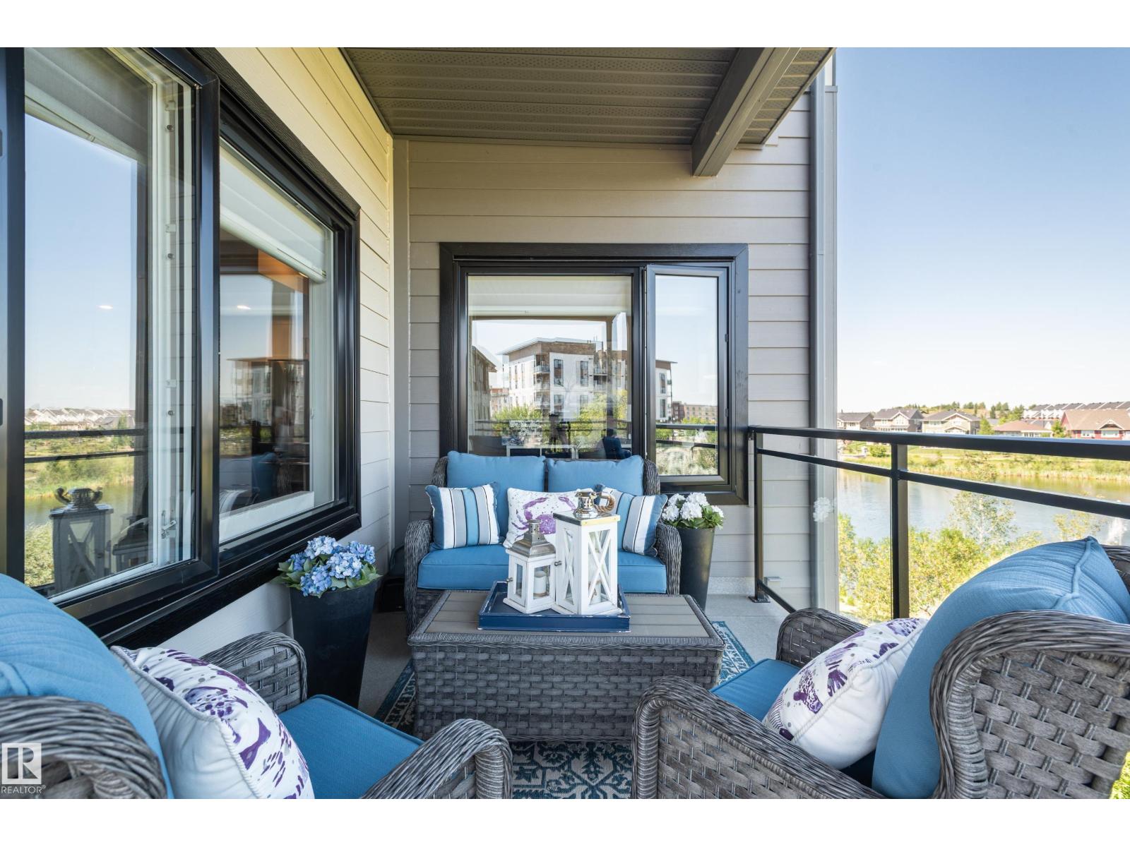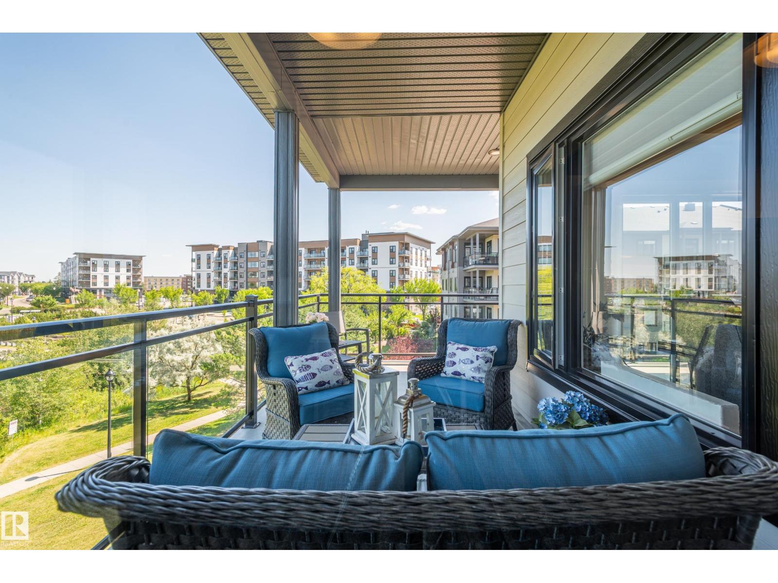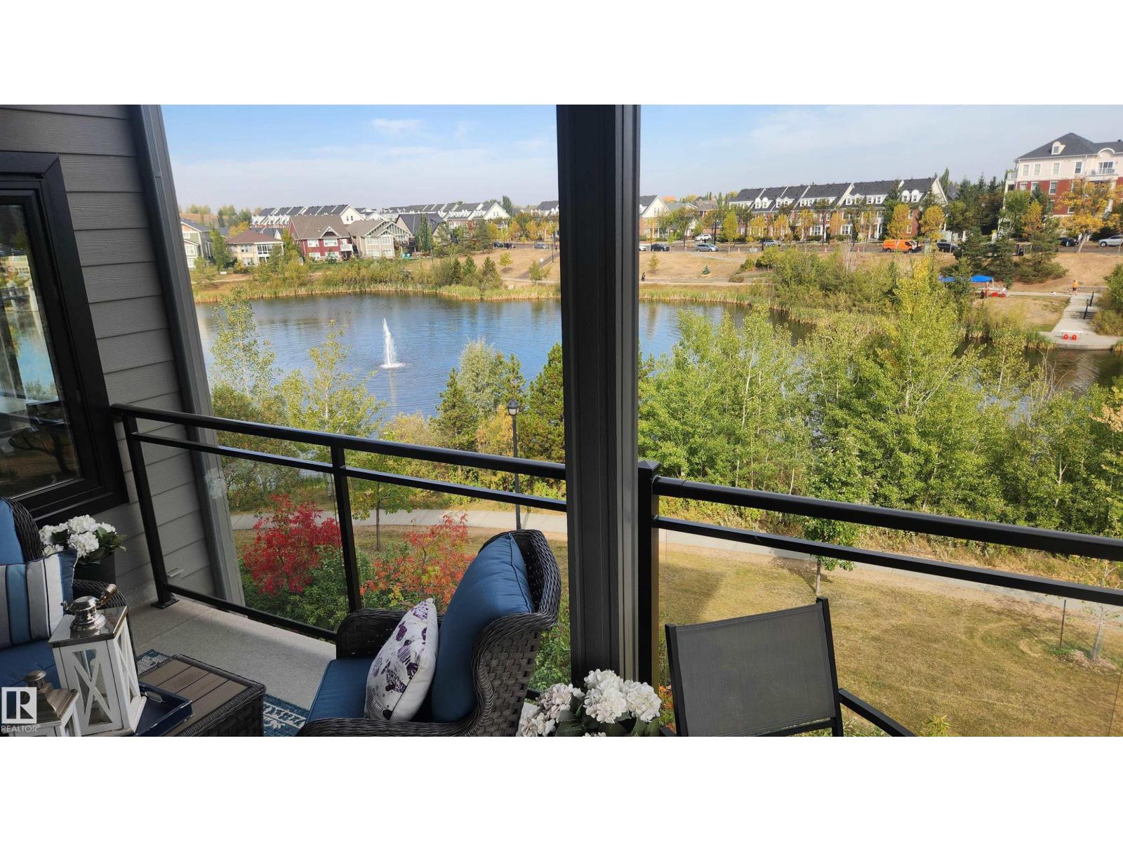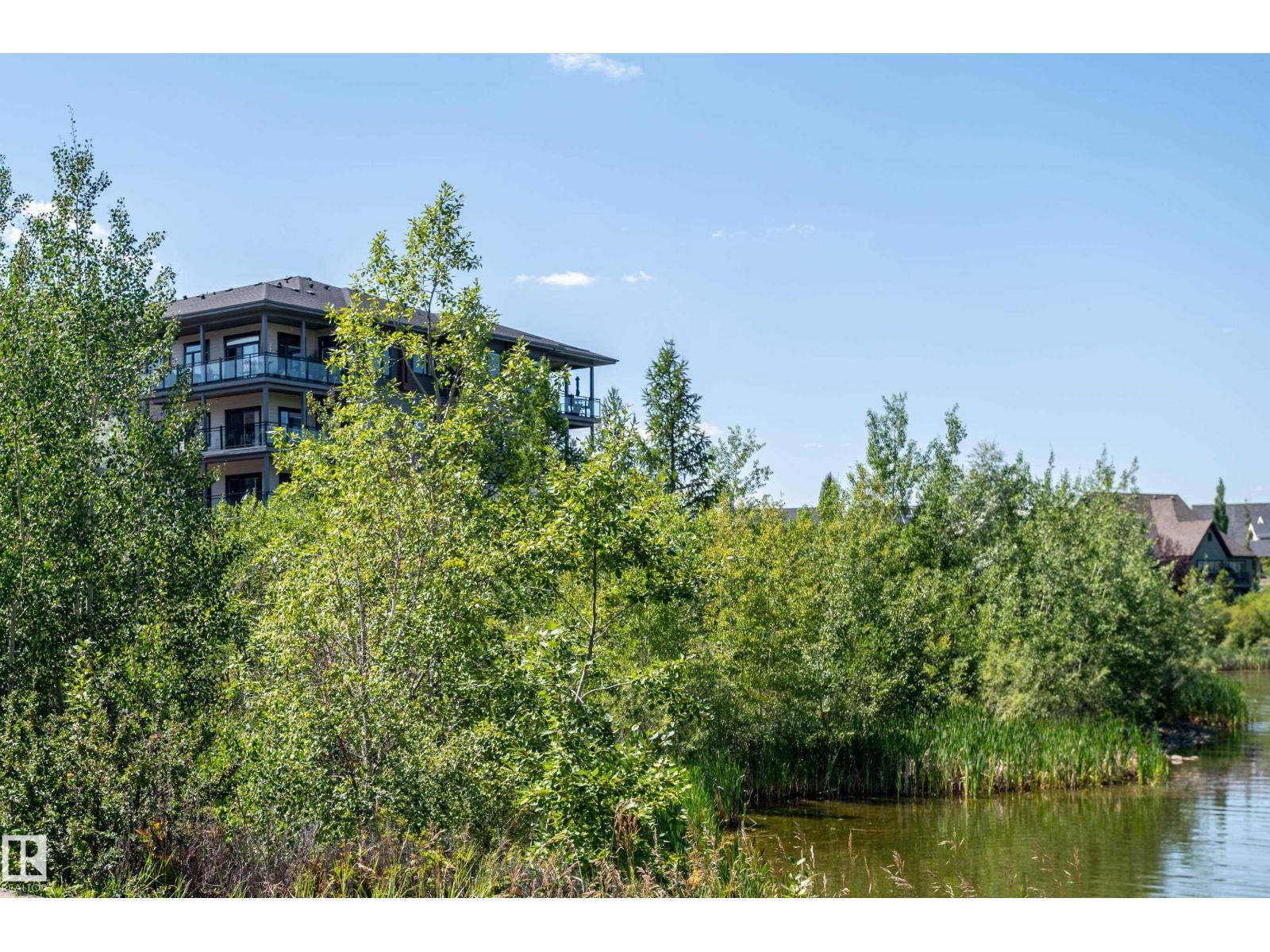 Extensively upgraded lake-facing corner unit in sought-after veritas, offering awe-inspiring views from every angle. this immaculate one-owner home features 2 spacious bdrms, 2 baths, & a bright den. enjoy sunny mornings & shady evenings on wrap-around deck. the two-tone kitchen is a standout with upgraded appliances, a tile backsplash, & a 6” extended island with added cabinetry on both sides. designer lighting, magazine-worthy layout & décor, & a spa-inspired ensuite. a/c. over $25,000 in thoughtful upgrades also include barn doors, premium flooring, custom shower tile, additional quartz countertops, blinds, hardware, & a second (surface) parking stall that adds everyday convenience, plus a heated stall with secure storage. pride of ownership shines throughout—clean, cozy, and stylish. located steps from countless amenities in one of edmonton’s most desirable communities, this home offers a seamless blend of comfort, elegance, and breathtaking views. style meets serenity in this griesbach gem! (id:62933)