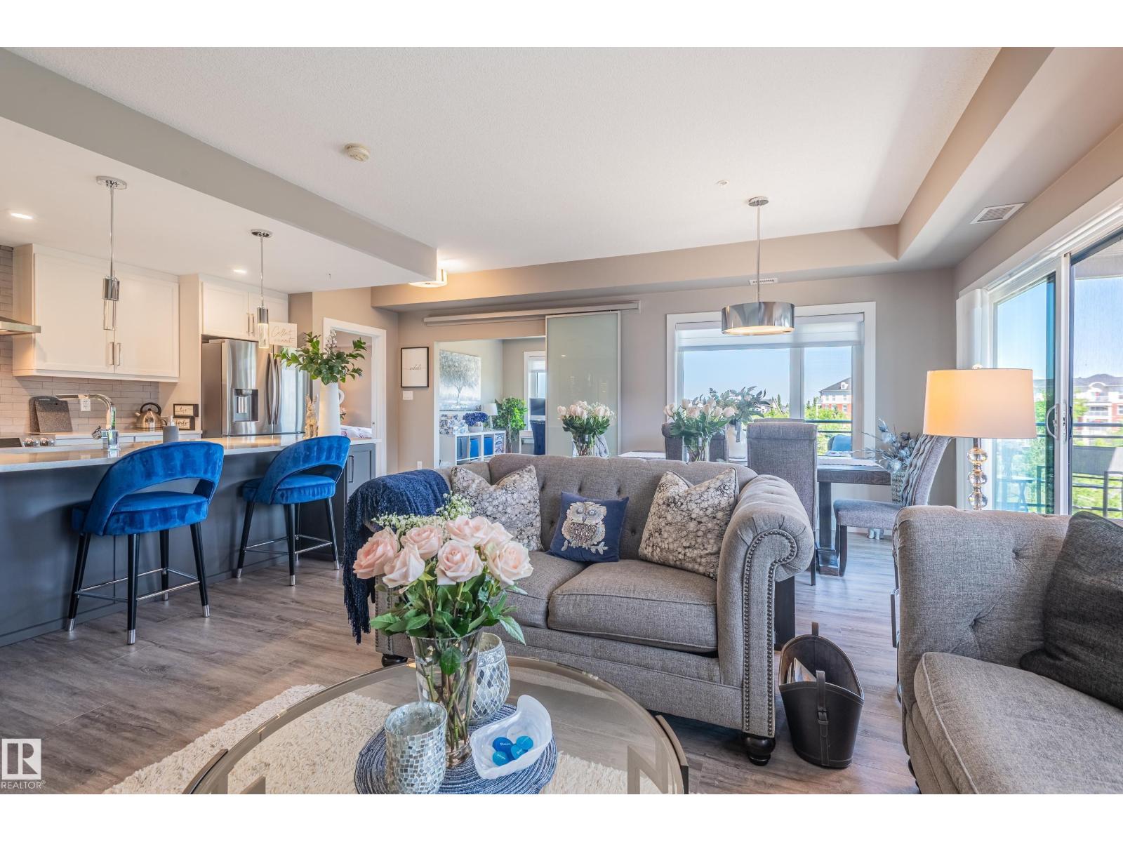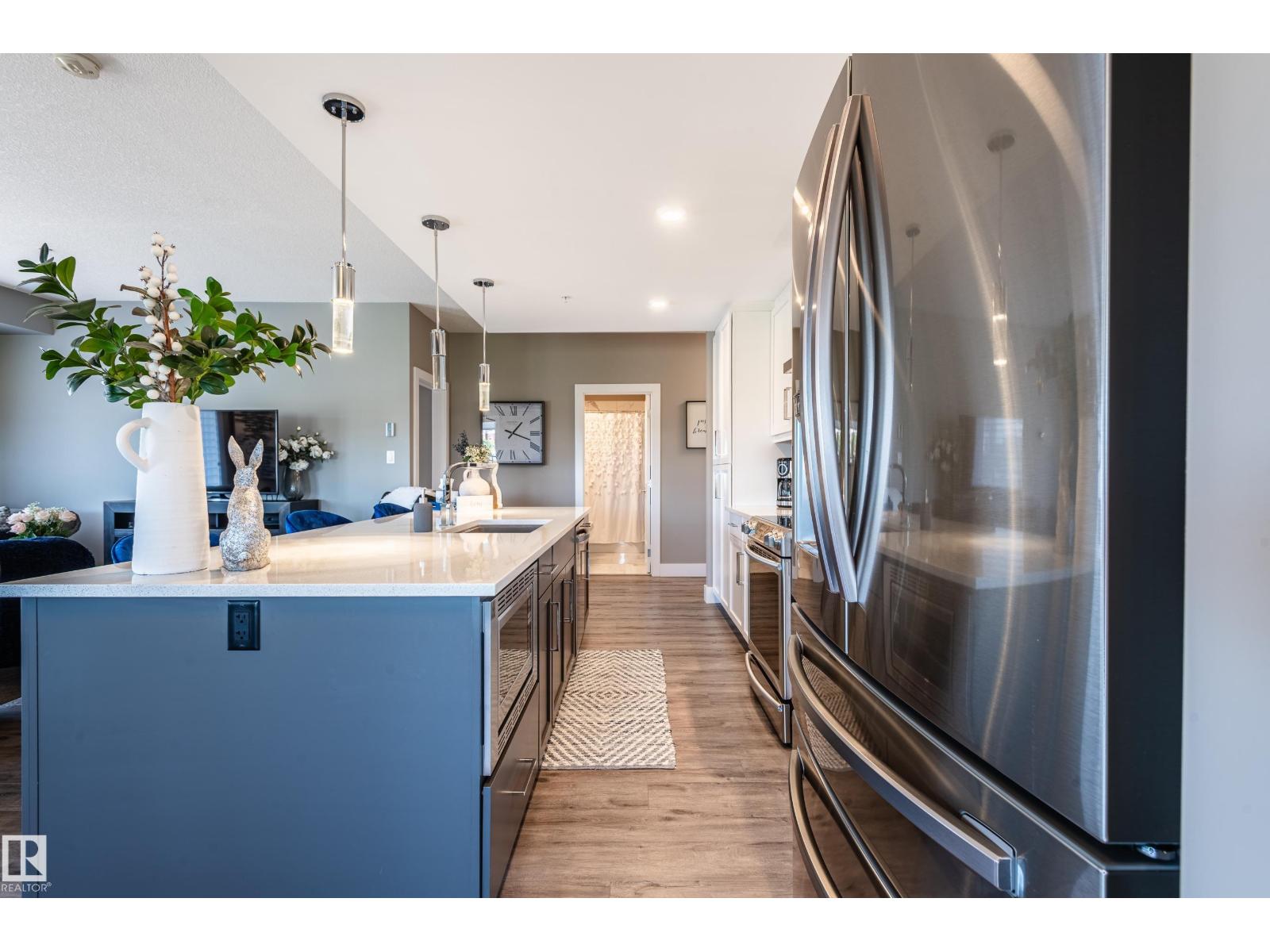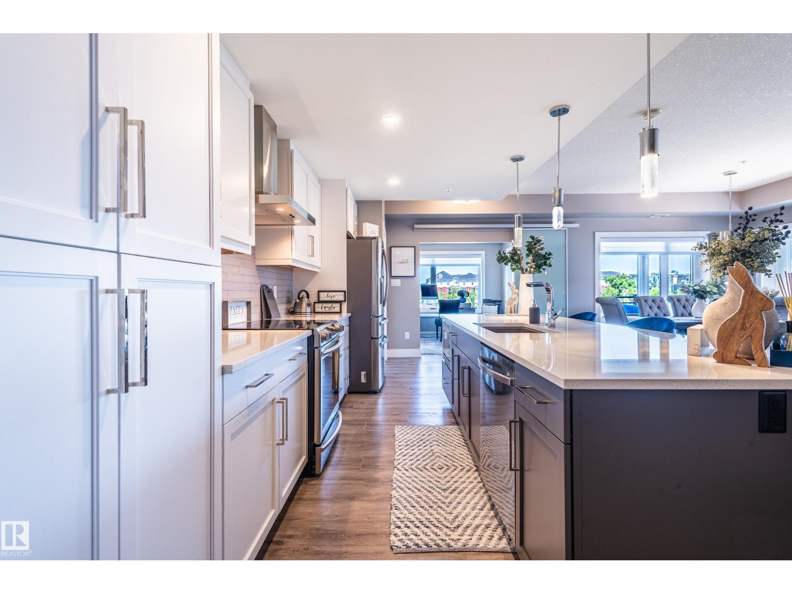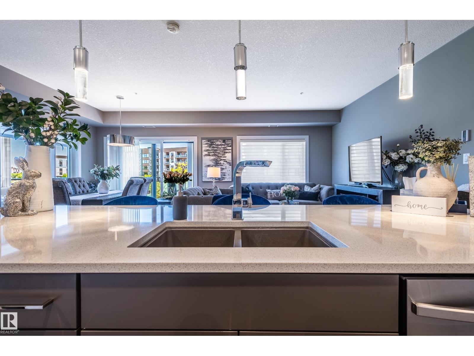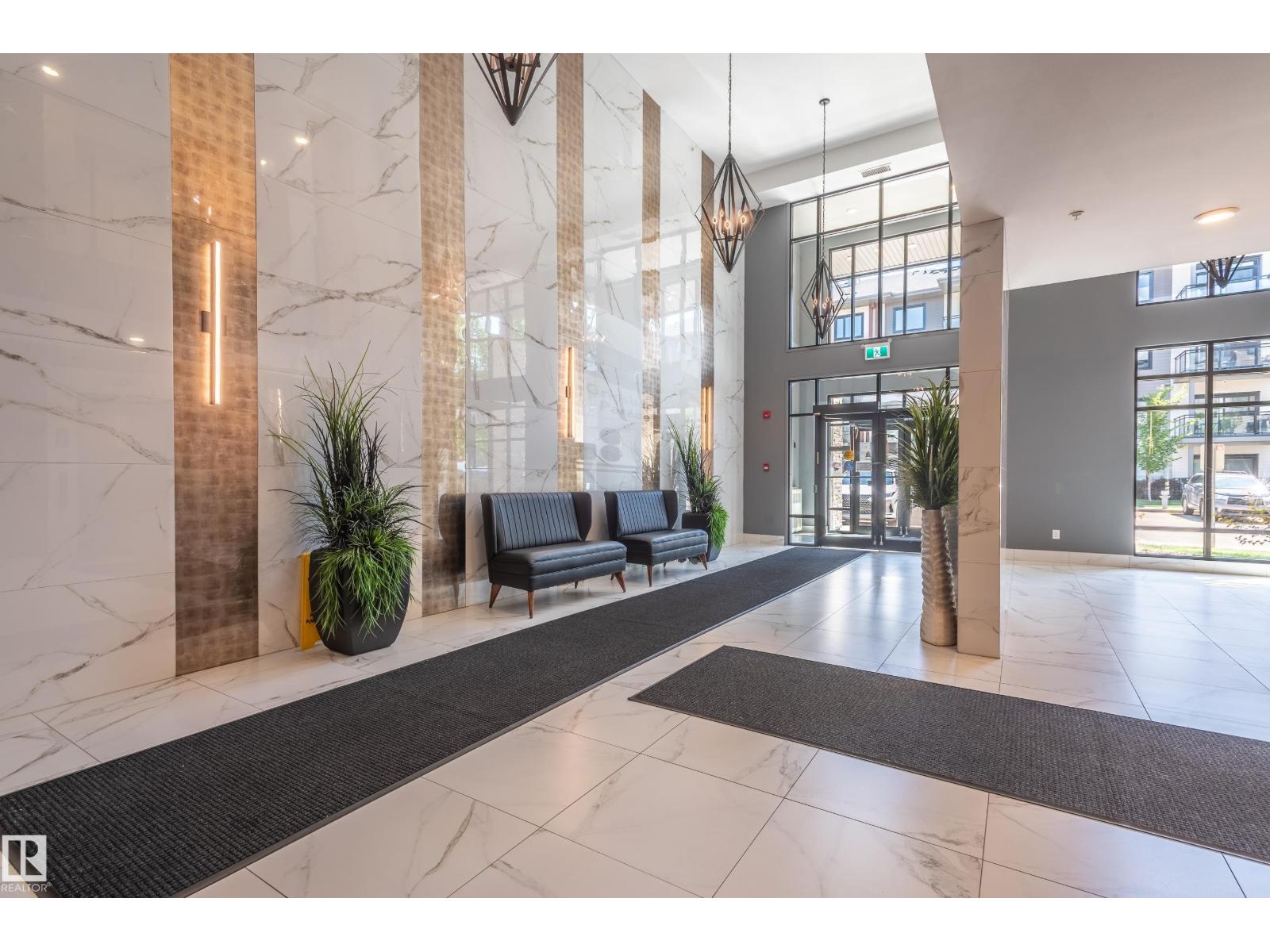 Extensively upgraded lake-facing corner unit in sought-after veritas, offering awe-inspiring views from every angle. this immaculate one-owner home features 2 spacious bdrms, 2 baths, & a bright den. enjoy sunny mornings & shady evenings on wrap-around deck. the two-tone kitchen is a standout with upgraded appliances, a tile backsplash, & a 6” extended island with added cabinetry on both sides. designer lighting, magazine-worthy layout & décor, & a spa-inspired ensuite. a/c. over $25,000 in thoughtful upgrades also include barn doors, premium flooring, custom shower tile, additional quartz countertops, blinds, hardware, & a second (surface) parking stall that adds everyday convenience, plus a heated stall with secure storage. pride of ownership shines throughout—clean, cozy, and stylish. located steps from countless amenities in one of edmonton’s most desirable communities, this home offers a seamless blend of comfort, elegance, and breathtaking views. style meets serenity in this griesbach gem! (id:62933)