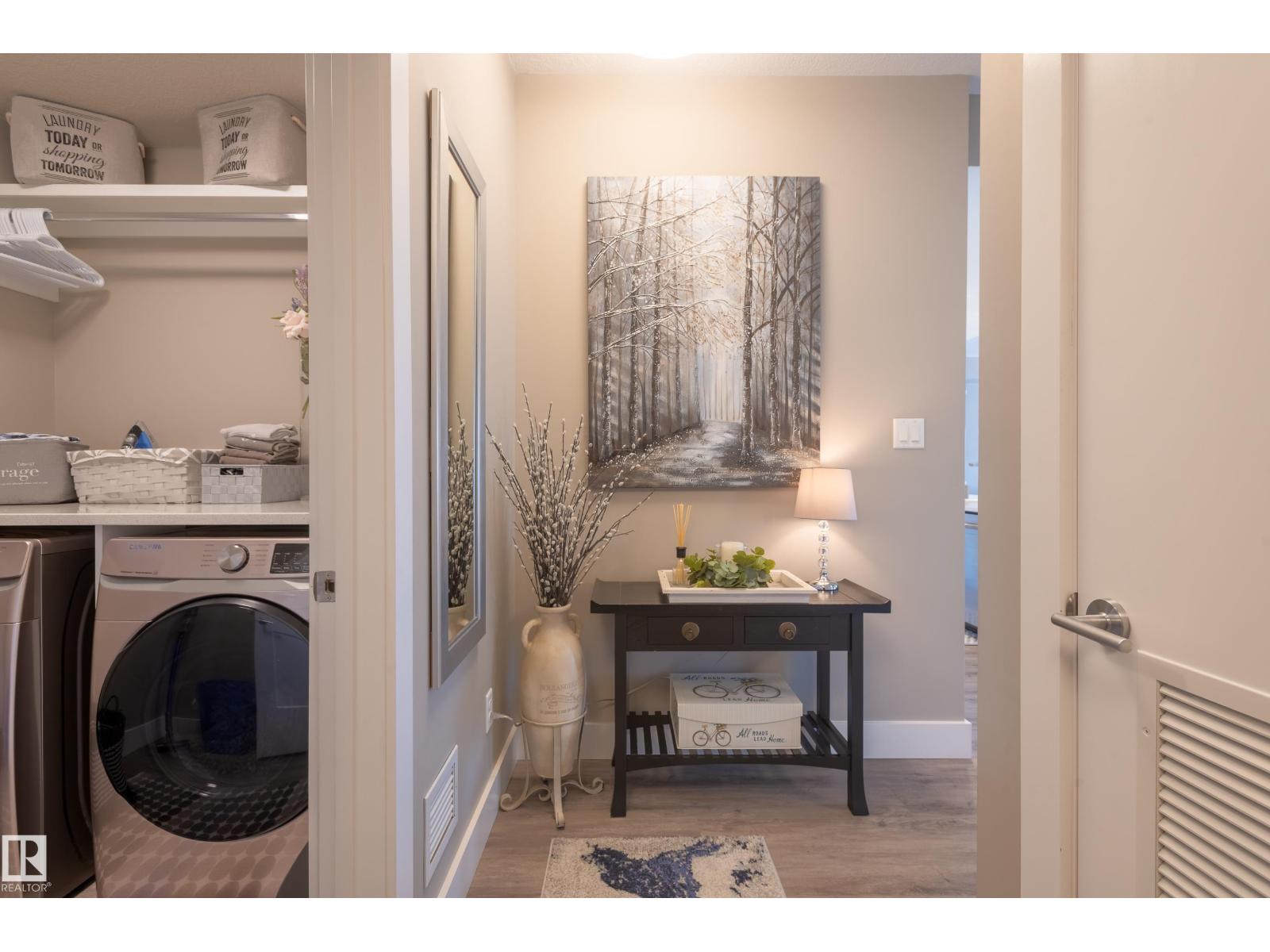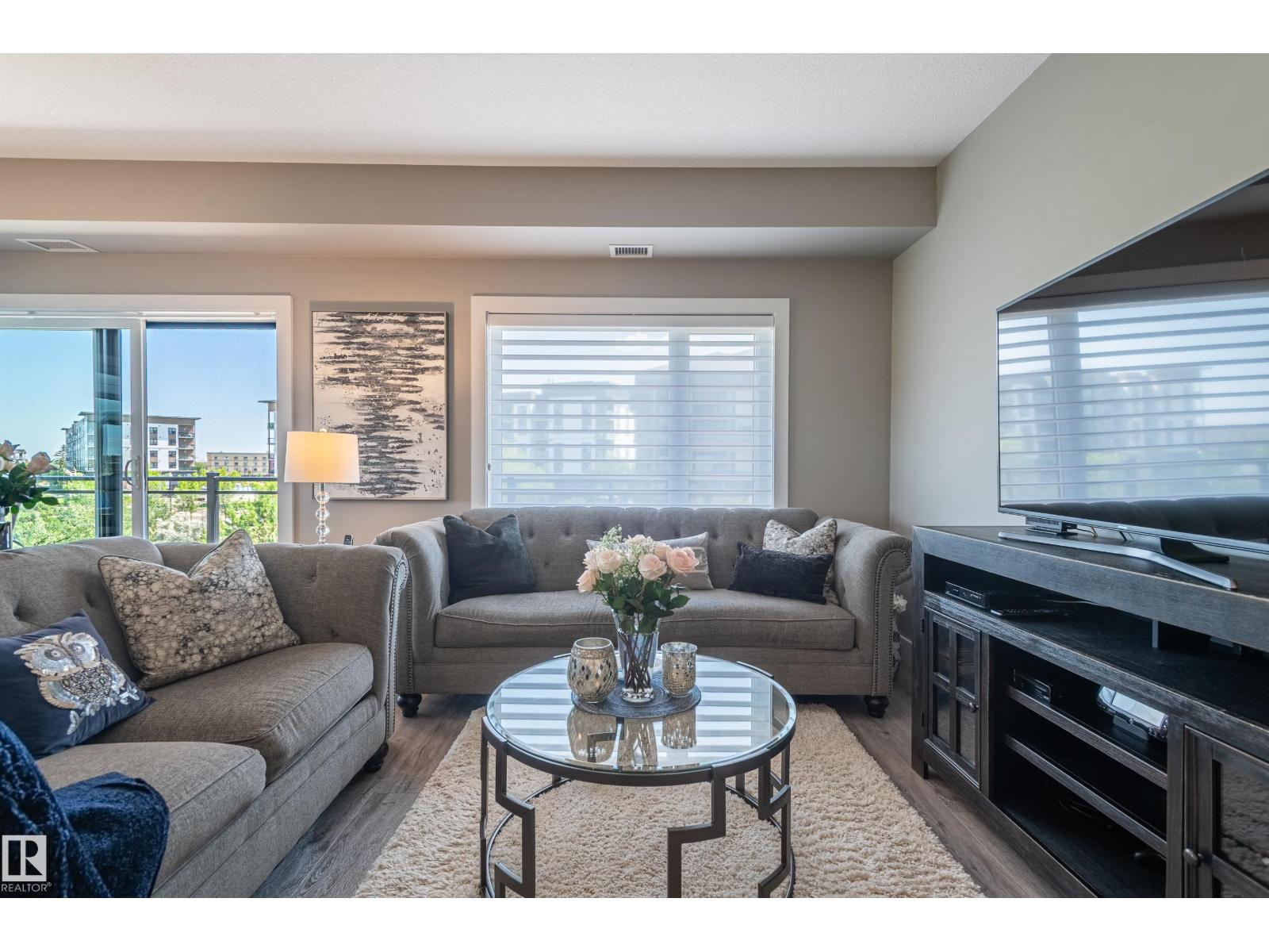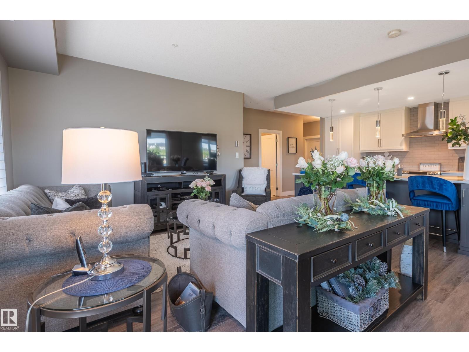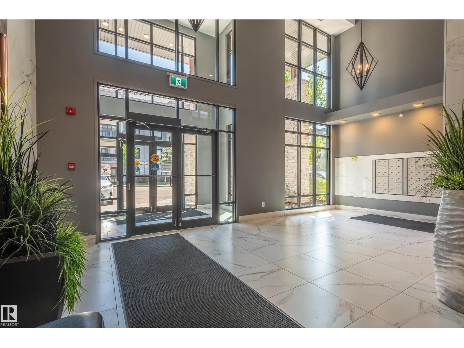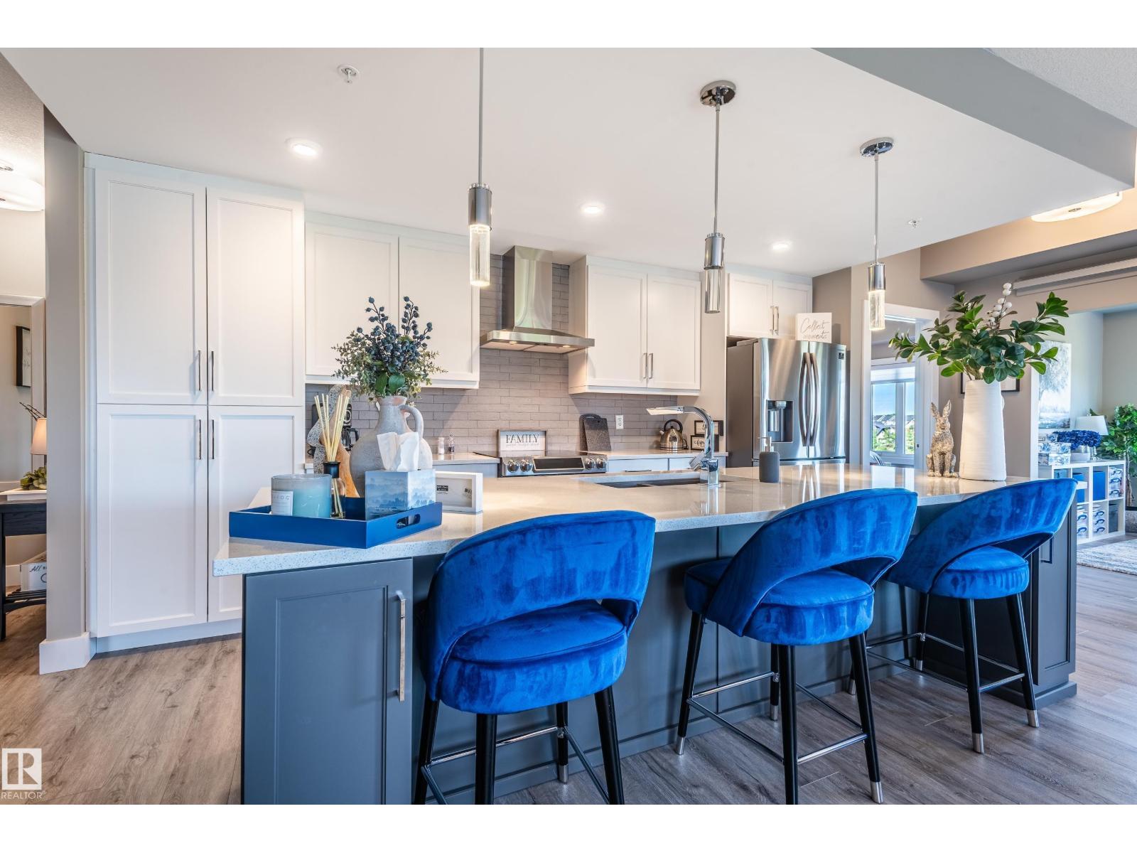 Extensively upgraded lake-facing corner unit in sought-after veritas, offering awe-inspiring views from every angle. this immaculate one-owner home features 2 spacious bdrms, 2 baths, & a bright den. enjoy sunny mornings & shady evenings on wrap-around deck. the two-tone kitchen is a standout with upgraded appliances, a tile backsplash, & a 6” extended island with added cabinetry on both sides. designer lighting, magazine-worthy layout & décor, & a spa-inspired ensuite. a/c. over $25,000 in thoughtful upgrades also include barn doors, premium flooring, custom shower tile, additional quartz countertops, blinds, hardware, & a second (surface) parking stall that adds everyday convenience, plus a heated stall with secure storage. pride of ownership shines throughout—clean, cozy, and stylish. located steps from countless amenities in one of edmonton’s most desirable communities, this home offers a seamless blend of comfort, elegance, and breathtaking views. style meets serenity in this griesbach gem! (id:62933)