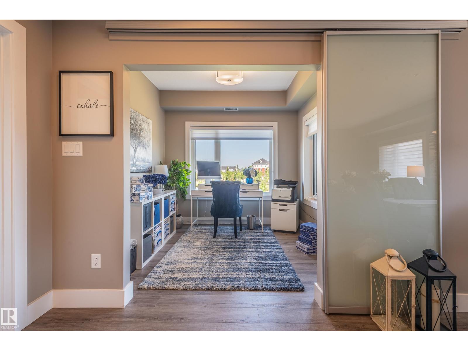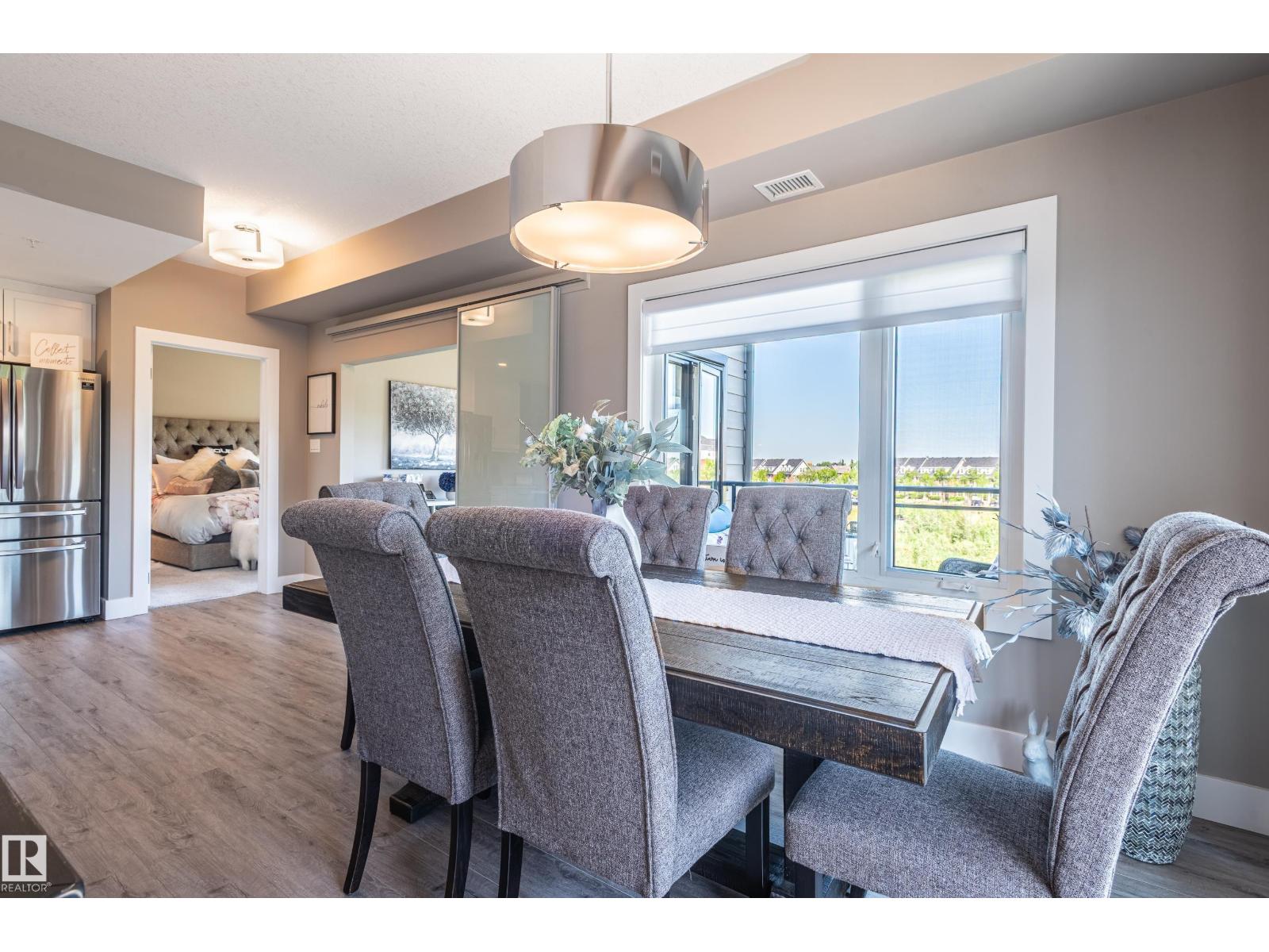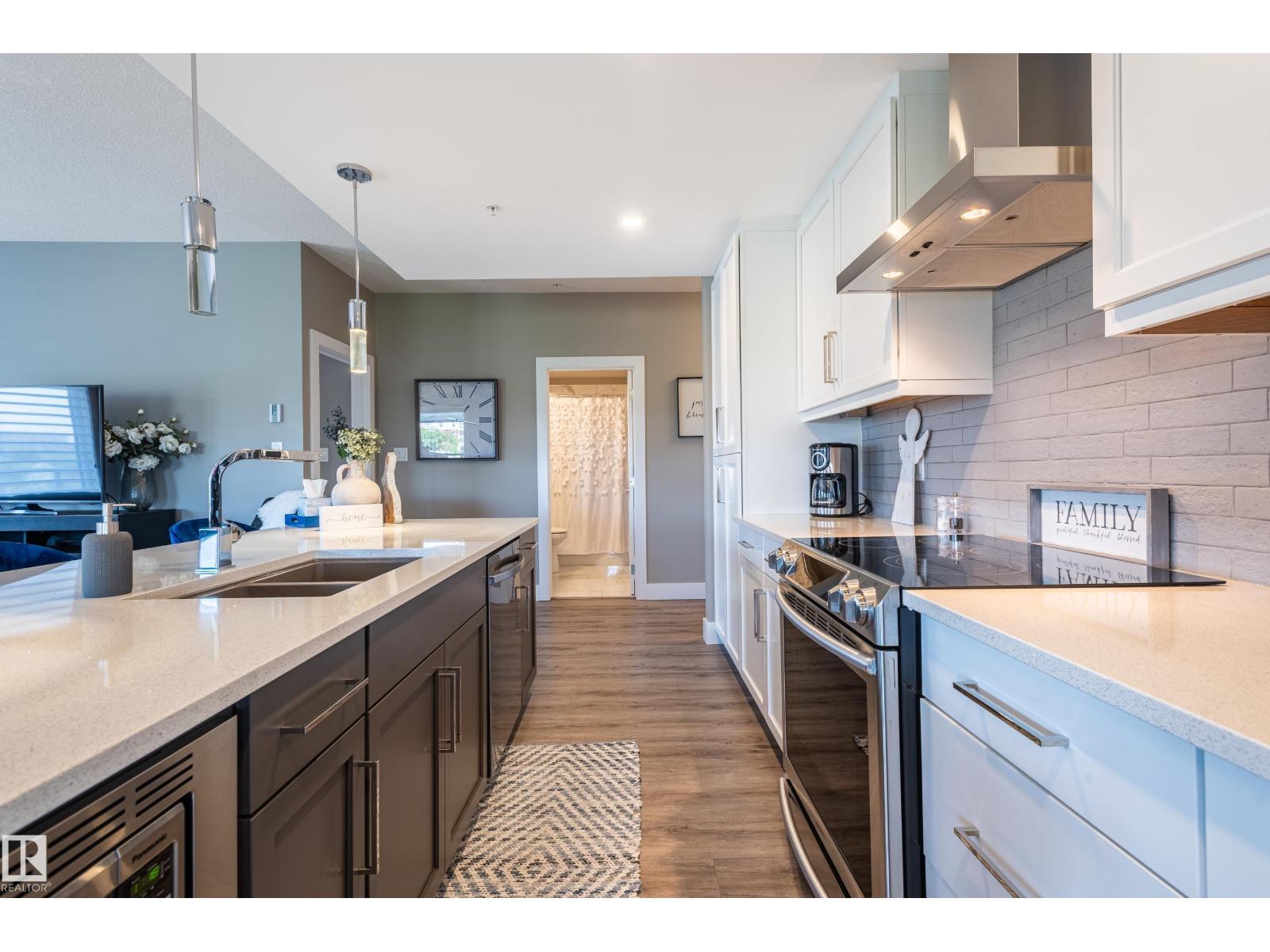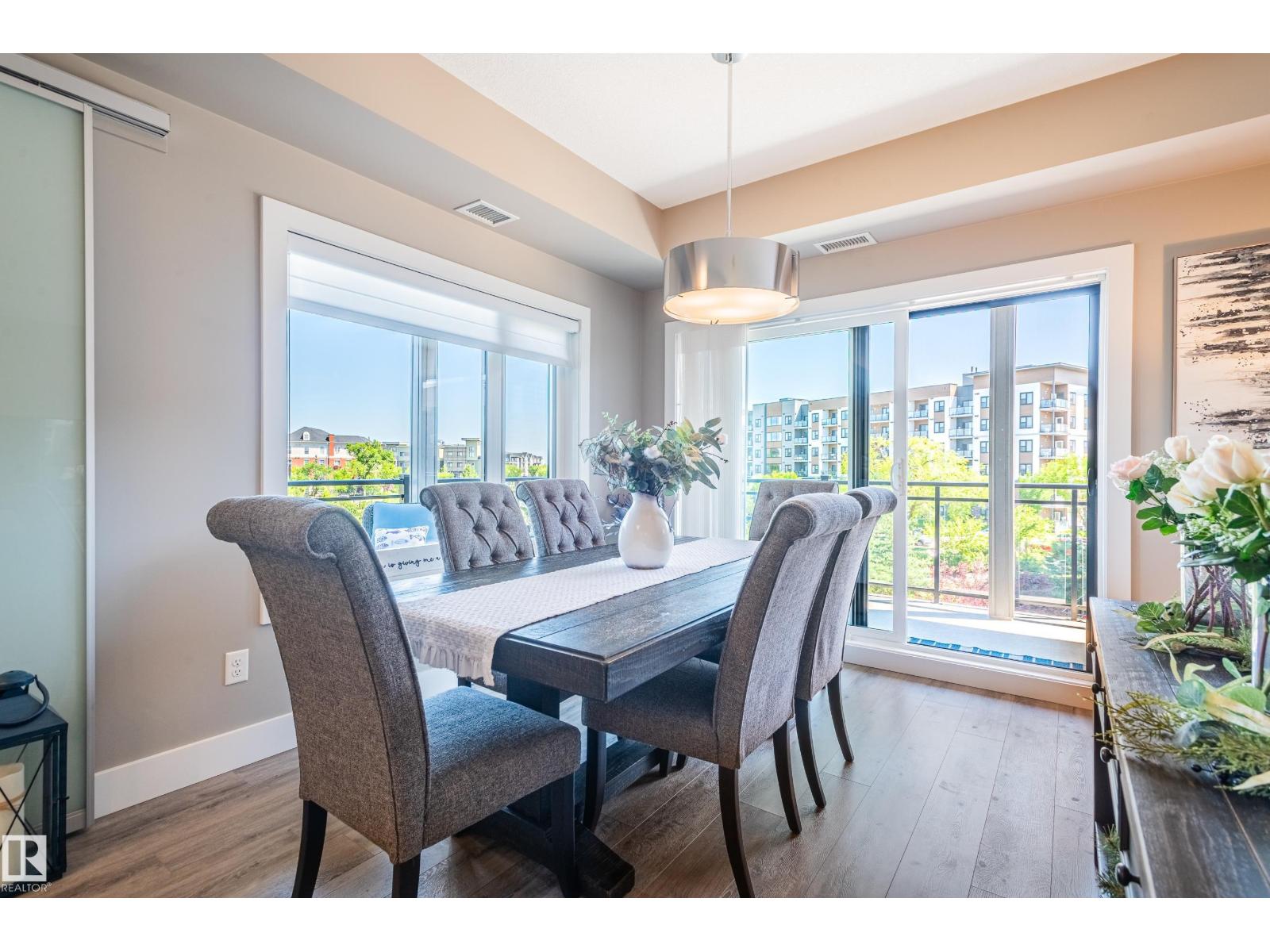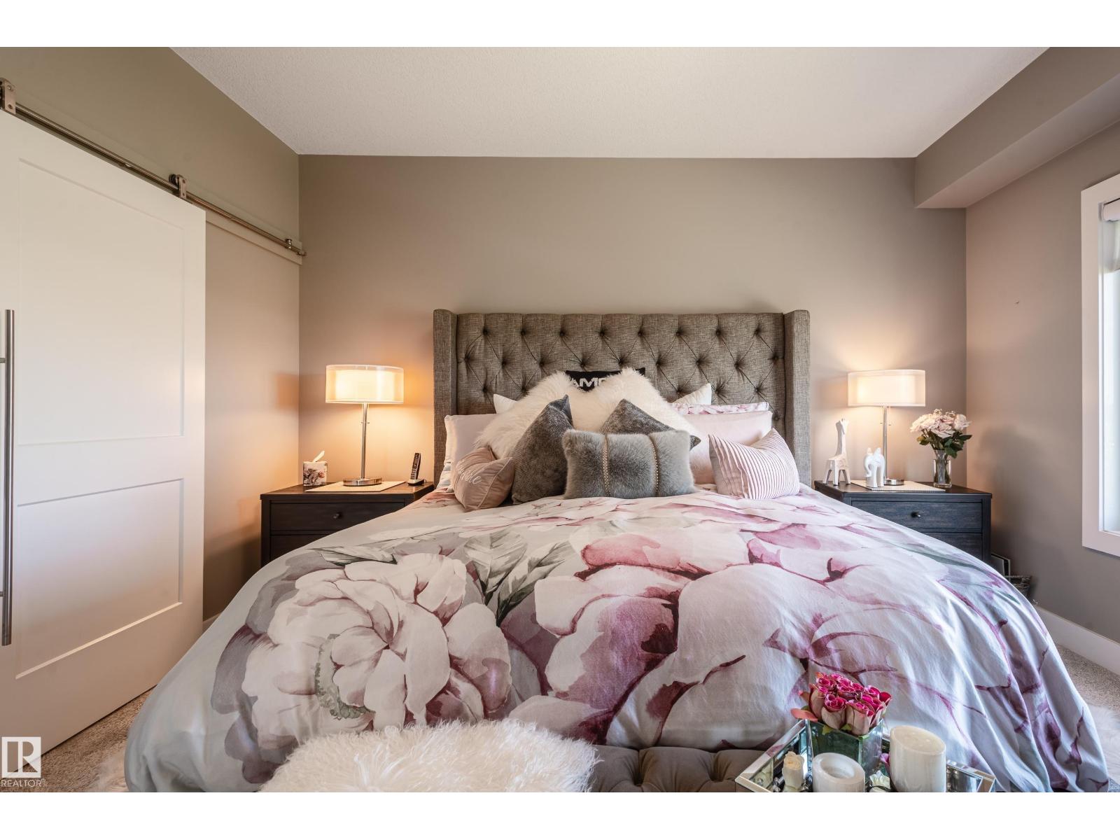 Extensively upgraded lake-facing corner unit in sought-after veritas, offering awe-inspiring views from every angle. this immaculate one-owner home features 2 spacious bdrms, 2 baths, & a bright den. enjoy sunny mornings & shady evenings on wrap-around deck. the two-tone kitchen is a standout with upgraded appliances, a tile backsplash, & a 6” extended island with added cabinetry on both sides. designer lighting, magazine-worthy layout & décor, & a spa-inspired ensuite. a/c. over $25,000 in thoughtful upgrades also include barn doors, premium flooring, custom shower tile, additional quartz countertops, blinds, hardware, & a second (surface) parking stall that adds everyday convenience, plus a heated stall with secure storage. pride of ownership shines throughout—clean, cozy, and stylish. located steps from countless amenities in one of edmonton’s most desirable communities, this home offers a seamless blend of comfort, elegance, and breathtaking views. style meets serenity in this griesbach gem! (id:62933)
